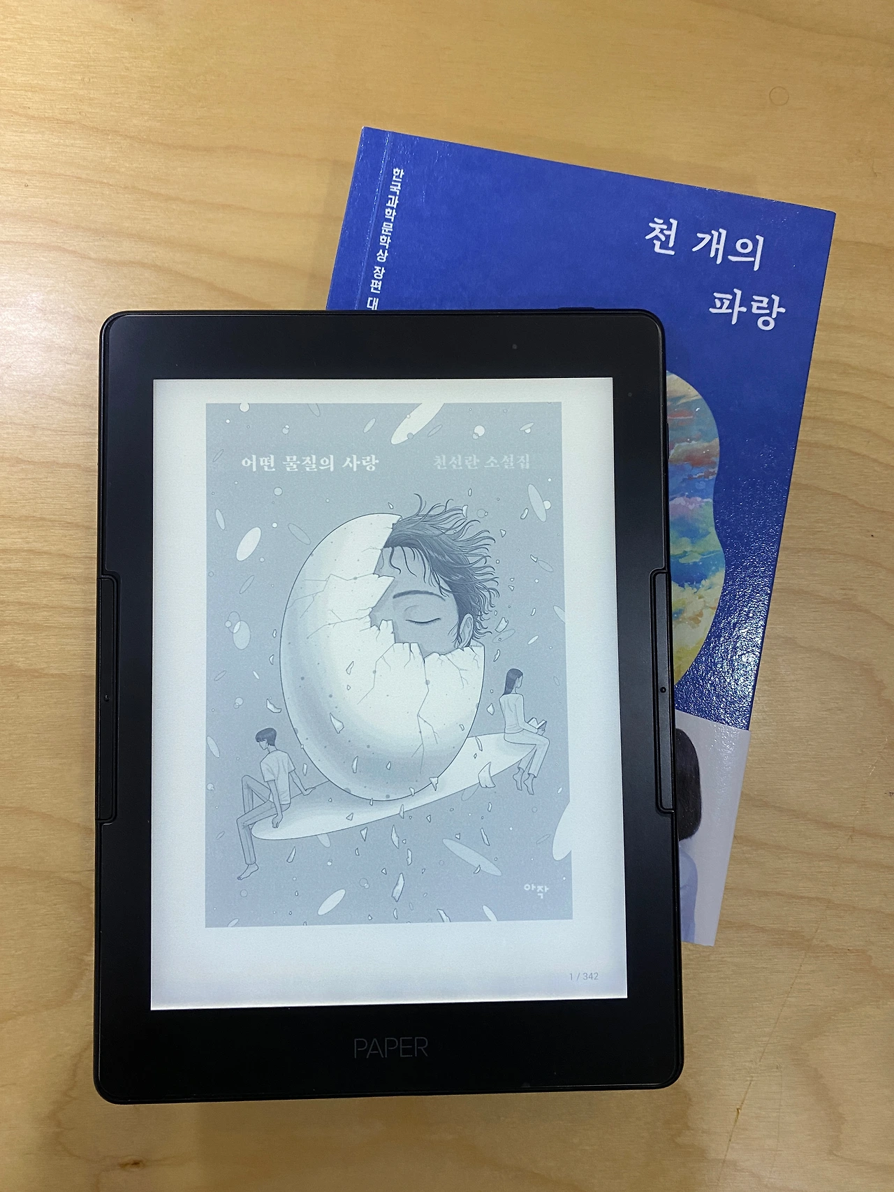 아직은 종이책이 좋지만 가끔은 전자책이 편할 때도 있다 내가 전자책으로 소설을 사는 경우의 대부분은 어떤 작품을 종이책을 읽고 그 작가의 다른 작품이 당장 읽고 싶어진 그 순간인 것 같다. 천선란의 소설집 [어떤 물질의 사랑]도 그래서 샀다. 오늘 아침에.