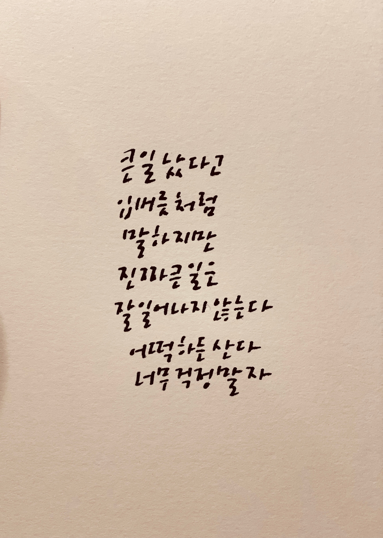 갑자기 닥친 코로나 19 때문에, 늘 모자라는 돈 때문에, 나를 속상하게 한 사람 때문에, 불확실한 미래 때문에... 심란할 일들은 곳곳에 널렸고 이러이러한 생각들에 휩싸여 있다 보면 나도 모르게 큰일 났네,라고 중얼거리게 된다. 그러나 따져보면 우리 인생에서 큰일은 그렇게 자주 일어나지 않는다. 설사 일어난다 해도 그건 정말 '큰일'이기 때문에 이미 우리 힘으론 어쩔 수가 없는 경우가 대부분이다. 어느 책에서 읽은 것처럼 우리가 걱정하는 일의 70~80%는 실제로 전혀 발생하지 않는다고 하지 않던가. 어떡하든 산다. 그러니 너무 걱정 말자. 이 또한 지나가리라.