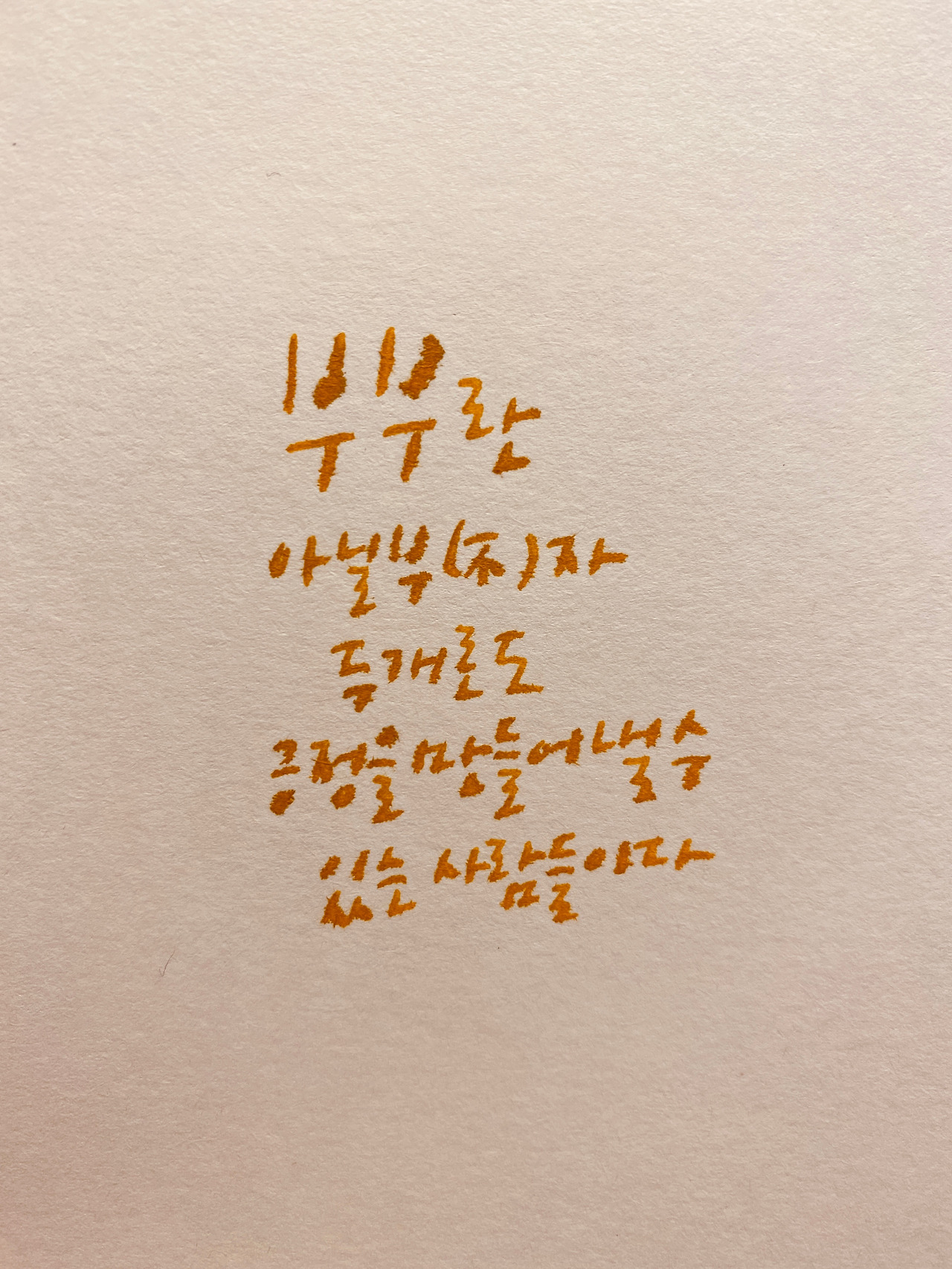 사이가 나쁘거나 멀어진 부부들의 공통점 중 하나는 "당신 도대체 왜 그러는데?"라는 질문(이라기보다는 비난)을 자주 한다는 것이다. 거기엔 분명 '나는 당신을 이해하지 못하겠어'라는 부정의 뜻이 담겨 있다. 그런데 생각해 보면 나와 다른 모든 존재는 어느 정도 부정을 품고 있지 않던가. 그러므로 불화의 원인은 부정 때문이 아니라 그걸 이겨내지 못하는 '부정적인 마음' 때문인 것이다. 생각이 여기까지 이르니 술자리에서 흘러나왔던 농담을 그냥 흘려버릴 수 없어 '공처가의 캘리'로라도 남겨보기로 했다. 아닐 부 (不) 자가 두 개라도 긍정으로 승화시키면 된다. 애처가에겐 어렵더라도 공처가는 가능하다. 공처가인 나는 오늘 또 이렇게 '제 논에 물 대기'를 감행했다.