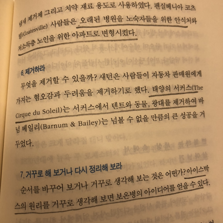 아이디어가 안 나와 회의실에서 혼자 잭 트라우트의 책을 아무 데나 펼쳤더니 '태양의 서커스는 서커스에서 텐트와 동물, 광대를 제거하여 큰 성공을 거두었다'라고 알려주는군요. 서커스에서 동물이나 광대를 뺄 생각을 하다니, 생각해 보니 정말 훌륭합니다. 본질에만 집중하는 태도에 경의를 표합니다. 그나저나 저는 오늘 저녁에 뭘 빼야 좋은 아이디어를 건질까요. 저녁을 굶어 살이나 뺄까요?