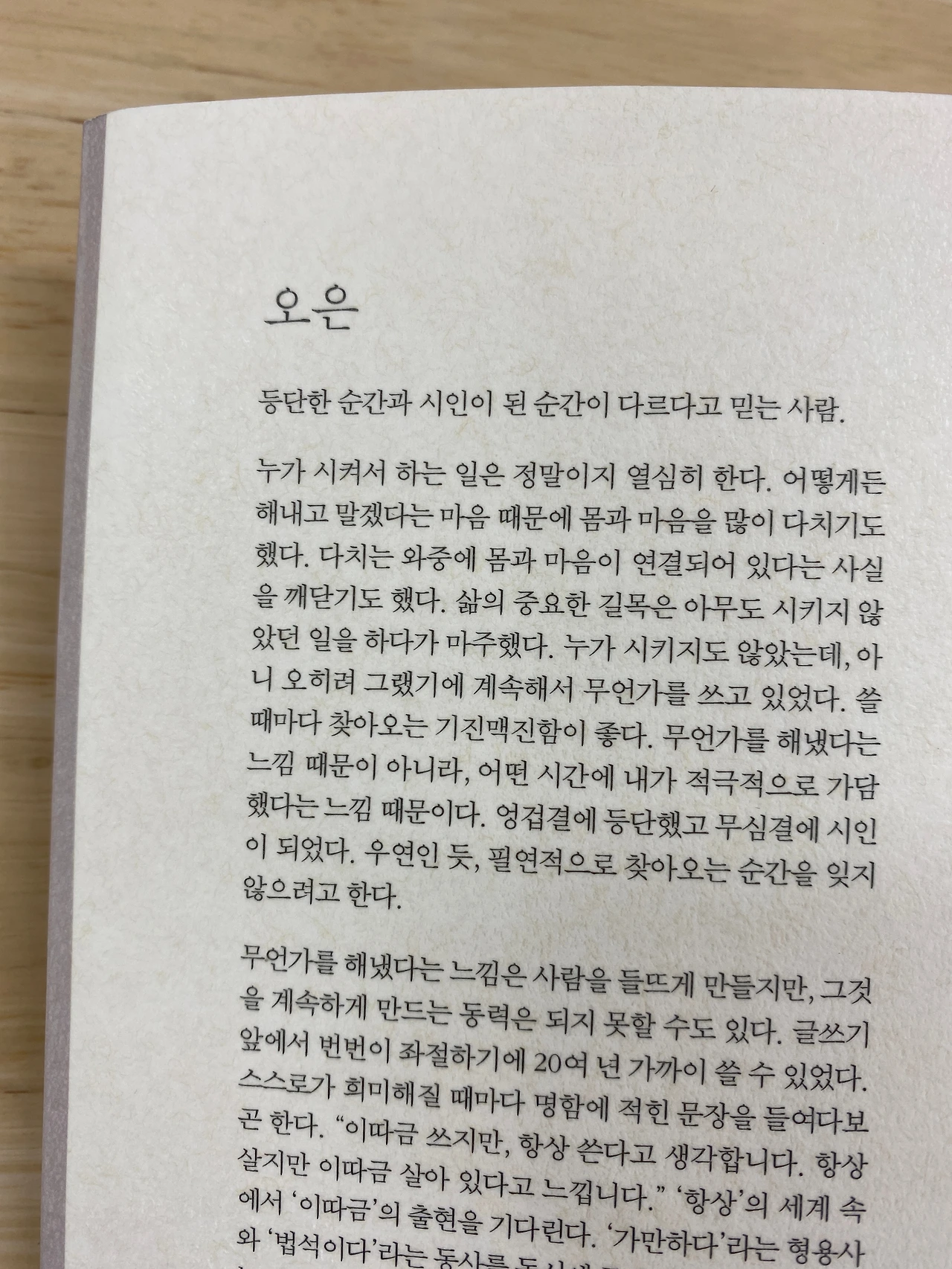 책날개에 조금 크게 쓰인 '오은'이라는 이름 아래로 이런 글이 쓰여 있었다. "누가 시키지도 않았는데, 아니 오히려 그랬기에 계속해서 무언가를 쓰고 있었다. 쓸 때마다 찾아오는 기진맥진함이 좋다. 무언가를 해냈다는 느낌 때문이 아니라, 어떤 시간에 내가 적극적으로 가담했다는 느낌 때문이다." 글을 쓰는 사람들은 다 이런 마음을 가지고 있지 않을까, 책을 읽기 전부터 감탄했다.