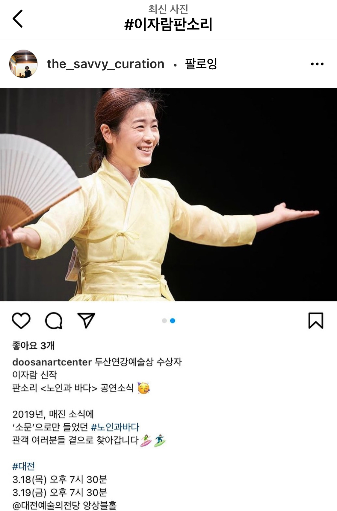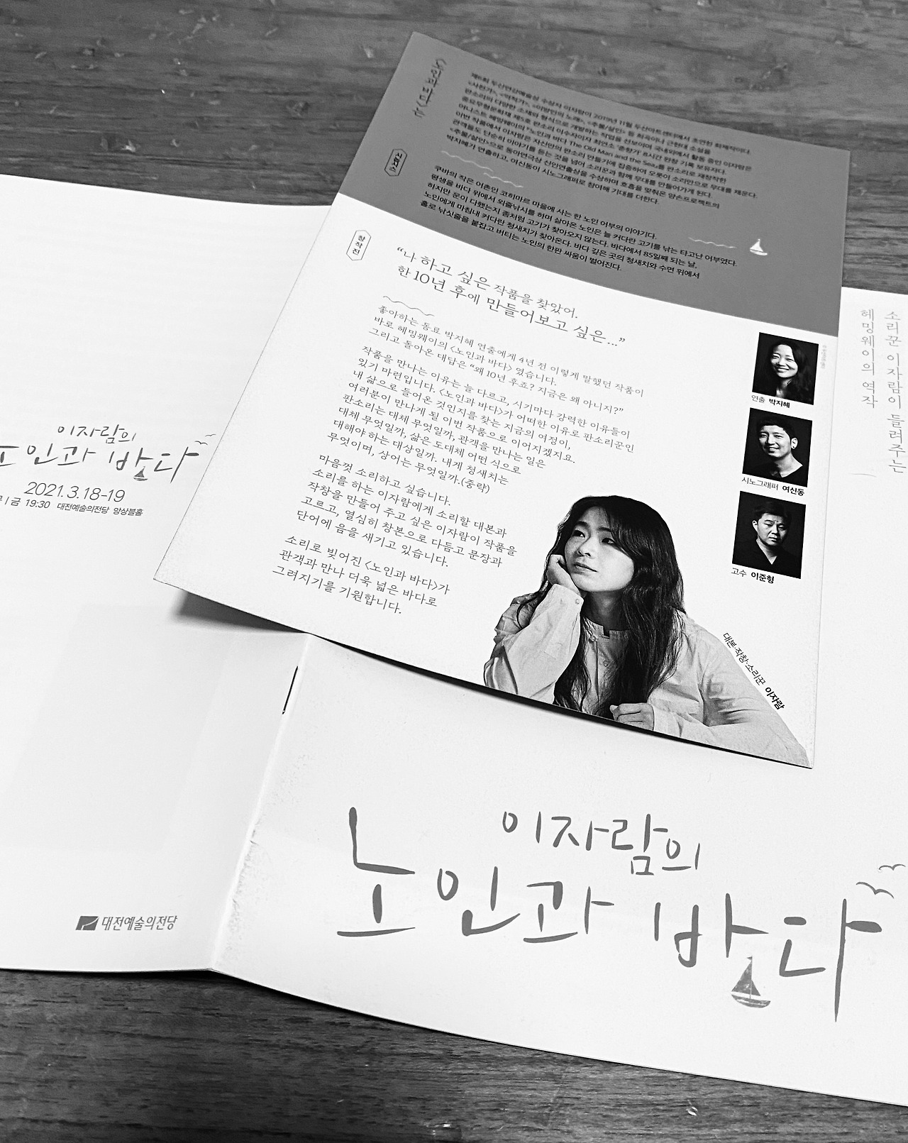 이자람의 창작 판소리 <노인과 바다>를 대전에서 보았다. 아내가 초연 때 몇 분 만에 티켓이 매진이 되었다며 울상을 지었던 공연은 부산 때 예매에 성공했으나 코로나 19 때문에 무산되었고 그 후로 소식이 없다가 이번에 대전예술의전당 스케줄이 잡혔던 걸 놓치지 않았던 것이다.
