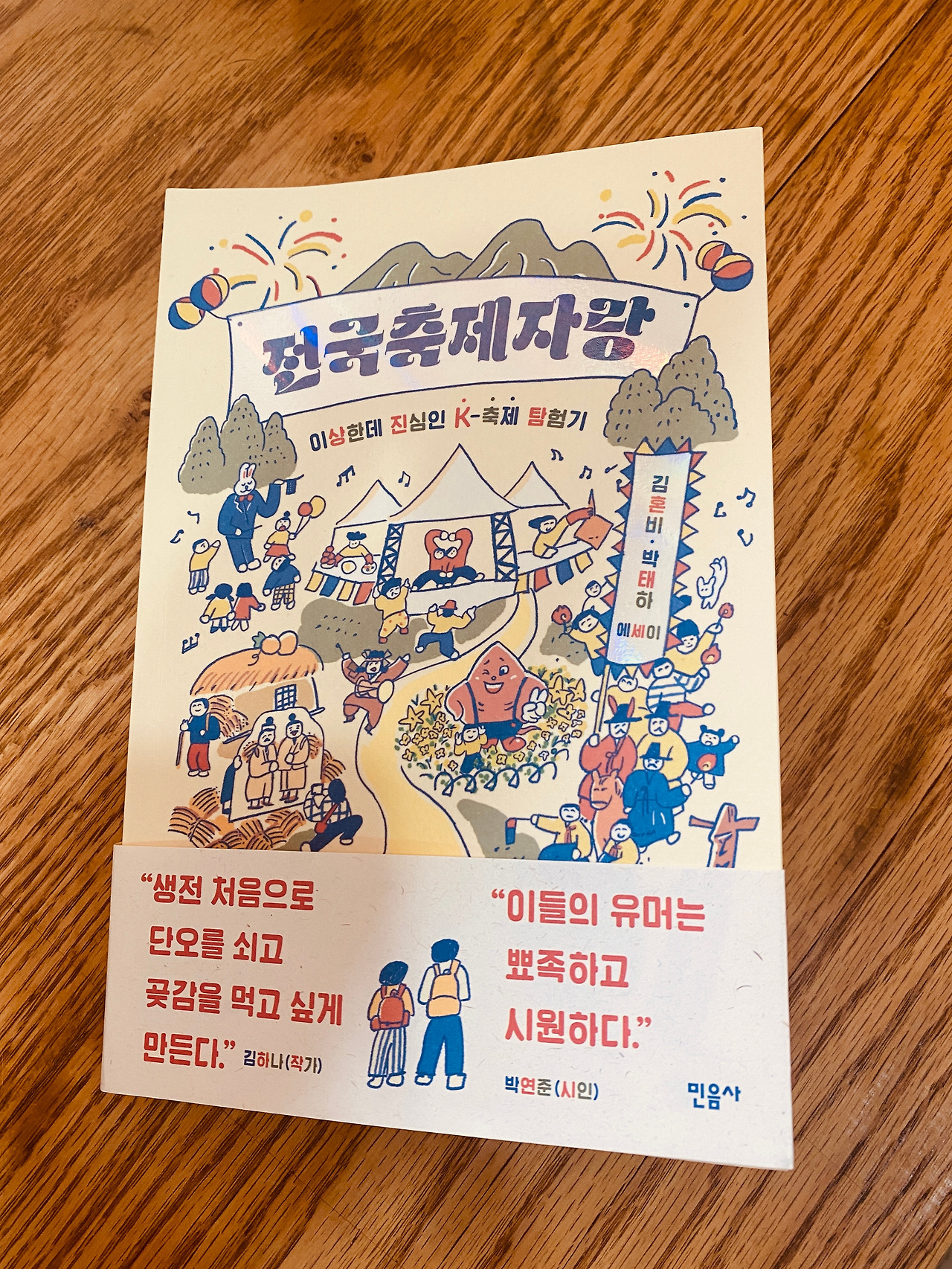 책으로 맺어진 사람들의 선한 기운을 듬뿍 받은 저는 돌아오는 KTX 안에서 전화 통화를 시도하는 청년을 가볍게 설득해 밖으로 내보내는 신공을 발휘하기에 이르렀습니다. 예전 같으면 생각도 못할 쾌거였습니다. 졸려서 눈을 감고 있다가『전국축제자랑』을 한 챕터 읽었는데 벌써 글 읽는 재미가 장난이 아니었습니다. 내가 무슨 복에 이런 독자들을 만나나 생각하며 책을 집어넣는데 동화책 책갈피에서 쪽지가 하나 툭 떨어지는 것이었습니다. 김미연 대표가 저를 만나기 전에 쓴 감사 쪽지였습니다. 아, 책 좋아하는 사람들은 참 대책 없이 좋은 사람들이 아닐 수 없습니다.
