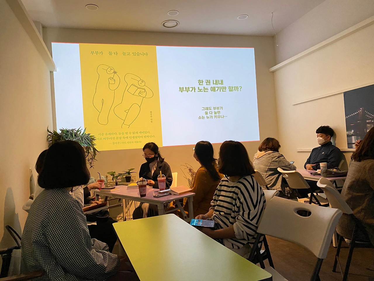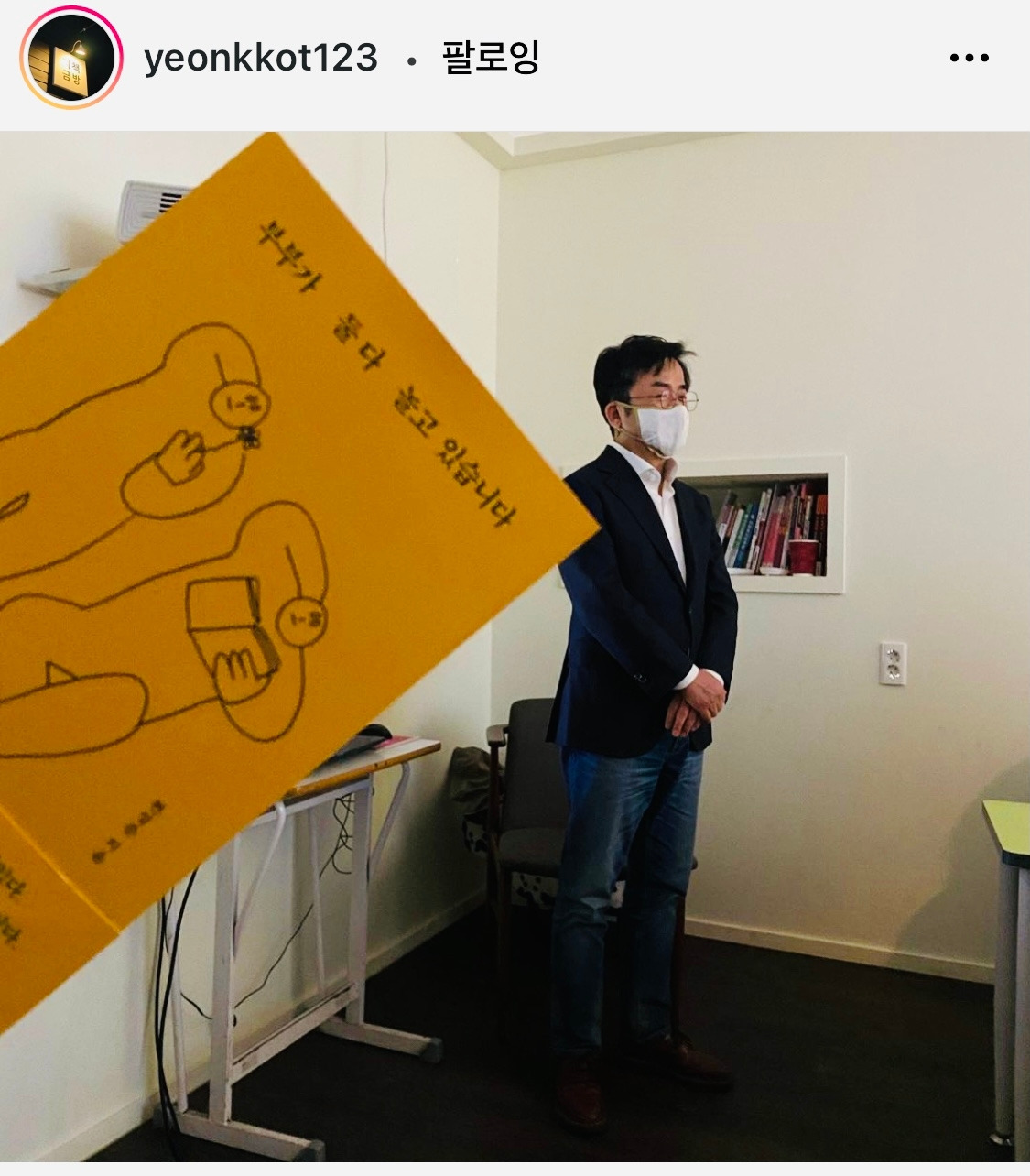 김미연 대표의 단골인 김밥집에서 김밥과 오뎅으로 요기를 하고 북토크 장소인 커피숍 '더착한커피'로 갔습니다. 여기는 책방 단골손님 중 교수님이 운영하시는 곳인데 북토크 장소 고민 얘기를 듣더니 흔쾌히 빌려주셨다고 했습니다. 강연장으로 들어가니 포항 분들도 있고 대구와 영천에서 오신 독자들도 있었습니다. 저는 "책 제목이 부부가 놀고 있습니다,라고 설마 한 권 내내 노는 이야기만 하겠겠습니까."라는 말로 북토크를 시작했습니다.