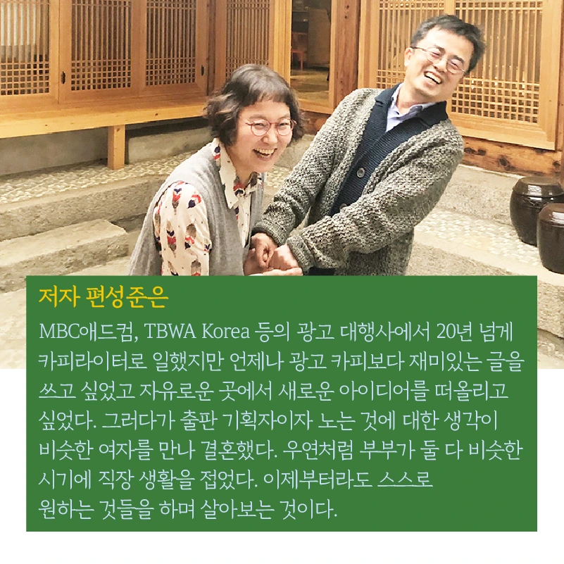 카피라이터 출신 작가. 『부부가 둘 다 놀고 있습니다』『살짝 웃기는 글이 잘 쓴 글입니다』『읽는 기쁨』『나를 살린 문장, 내가 살린 문장』 등 출간.