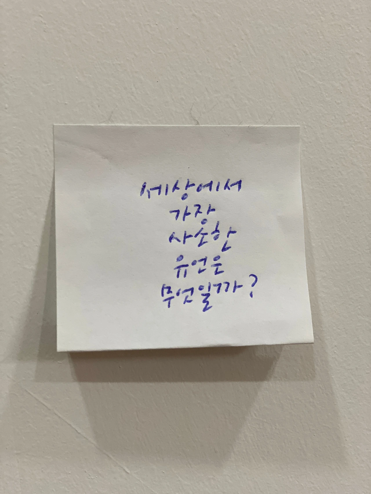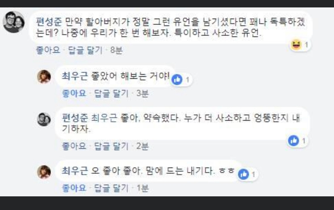 극작가이면서 고등학교 동창이기도 한 최우근은 재미있고 유머러스한 글을 쓰기로 유명한 친구인데 몇 년 전에 느닷없이 '사소한 유언을 한 번 써보자'라는 의견을 페이스북에 올렸다. 예를 들어 할아버지가 '미용실은 매번 다른 곳으로 다녀라'라는 유언을 남기셨다면 꽤 재밌지 않겠느냐는 것이었다. 우리는 누가 더 특이하고 사소한 유언을 생각해 내나 내기를 하기로 했다. 나는 '후라이드 반 양념 반은 주문하지 마라' '이쑤시개는 사용하지 마라' 같은 실용적인 유언을 개발했고 같은 고등학교 동창인 상준이도 '라면 끓일 때 물을 두 숟가락 적게 넣어라' 같은 훌륭한 의견을 보탰다.