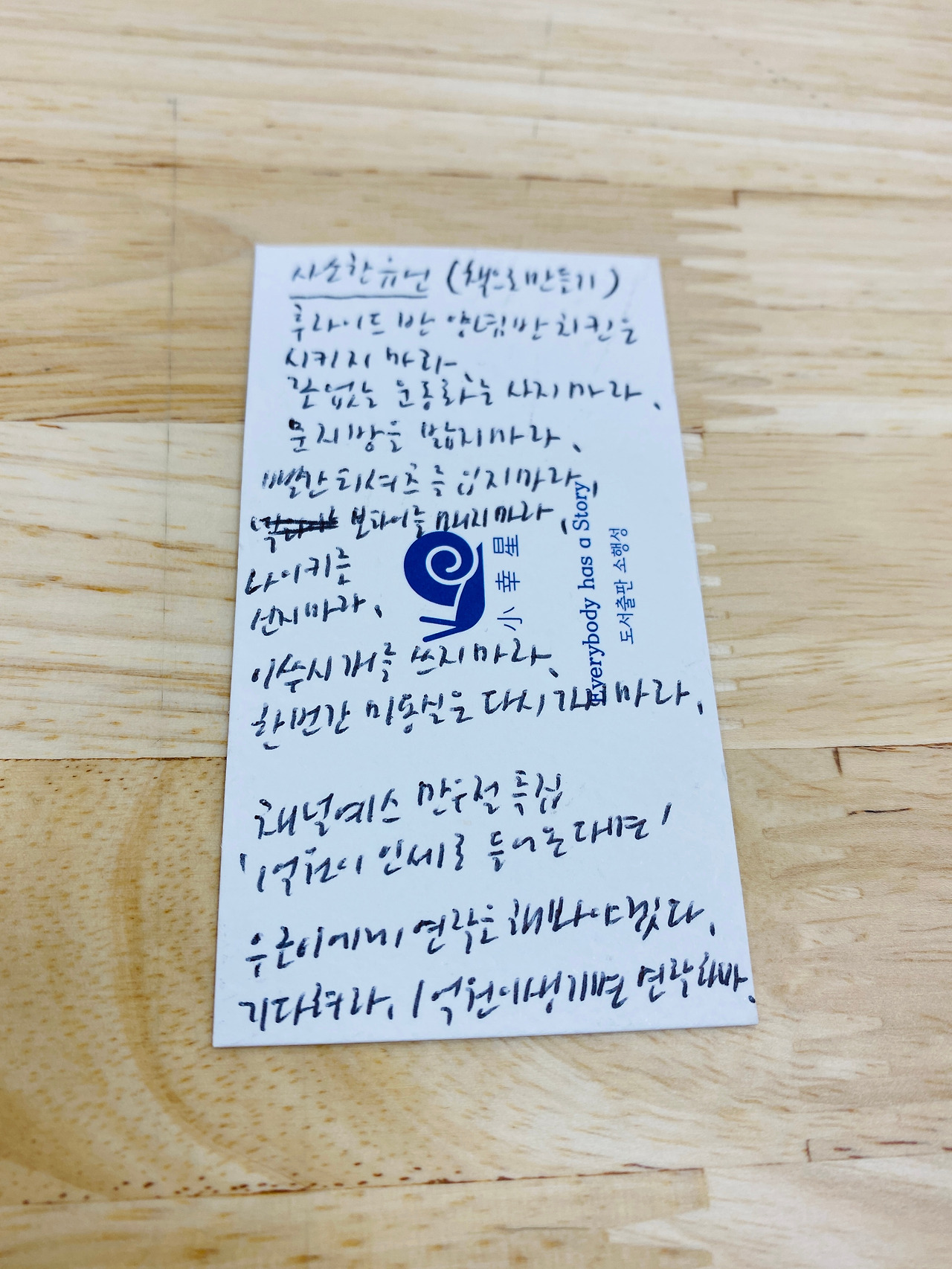 길상사에서 '머리맡에 남아 있는 책을 나에게 신문을 배달한 사람에게 전해주면 고맙겠다'라고 한 법정스님의 유언을 읽고 가슴 뭉클했던 기억이 있다. 그 유언을 전해 듣고 신문 배달하는 분은 무슨 생각을 했을까. 어제 성북동 커피숍 '일상'에서 아내와 커피를 마시다가 그 생각이 났다. 내가 법정 스님처럼 따뜻한 유언을 남기진 못하겠지만 그래도 한 번 해보자 하고 내 명함에 메모를 하고 있으려니 아내도 사연을 듣고는 '탕수육 부먹 하지 마라'라는 유언을 남기고 싶다고 했다. 나는 '끈 없는 운동화는 사지 마라' '빨간 티셔츠는 입지 마라' 나이키를 신지 마라' 같은 자질구레한 유언을 더 생각해 내고는 공돈이 생기면 이걸 공모해서 꼭 책으로 내야지 하고 다짐했다. 아마 세상에서 가장 쓸모없고 강력하게 싱거운 책이 되지 않을까 예상한다. 이제 공돈 1억 원만 생기면 된다. 우근아, 전화할게. 돈만 생기면 바로. 우리 인세 수입은 깔끔하게 오 대 오로 나누기로 하자.