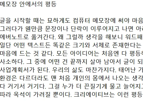 글을 시작할 때는 묘하게도 컴퓨터 메모장에 써야 마음이 놓입니다. 그러다가 웬만큼 문장이나 단락이 이루어지고 나면 아래한글이나 에버노트로 옮겨갑니다. 왜 그럴까 생각을 해보니 워드패드에서는 일단 어떤 텍스트든 똑같은 크기와 서체로 존재한다는 사실이 마음에 드는 것 같습니다. 모든 아이디어는 처음엔 다 평등하게 찌질하고 사소합니다. 그중에 어떤 건 끝까지 살아남아서 글이 되고 영화가 되고 사업계획서가 되는 거죠.