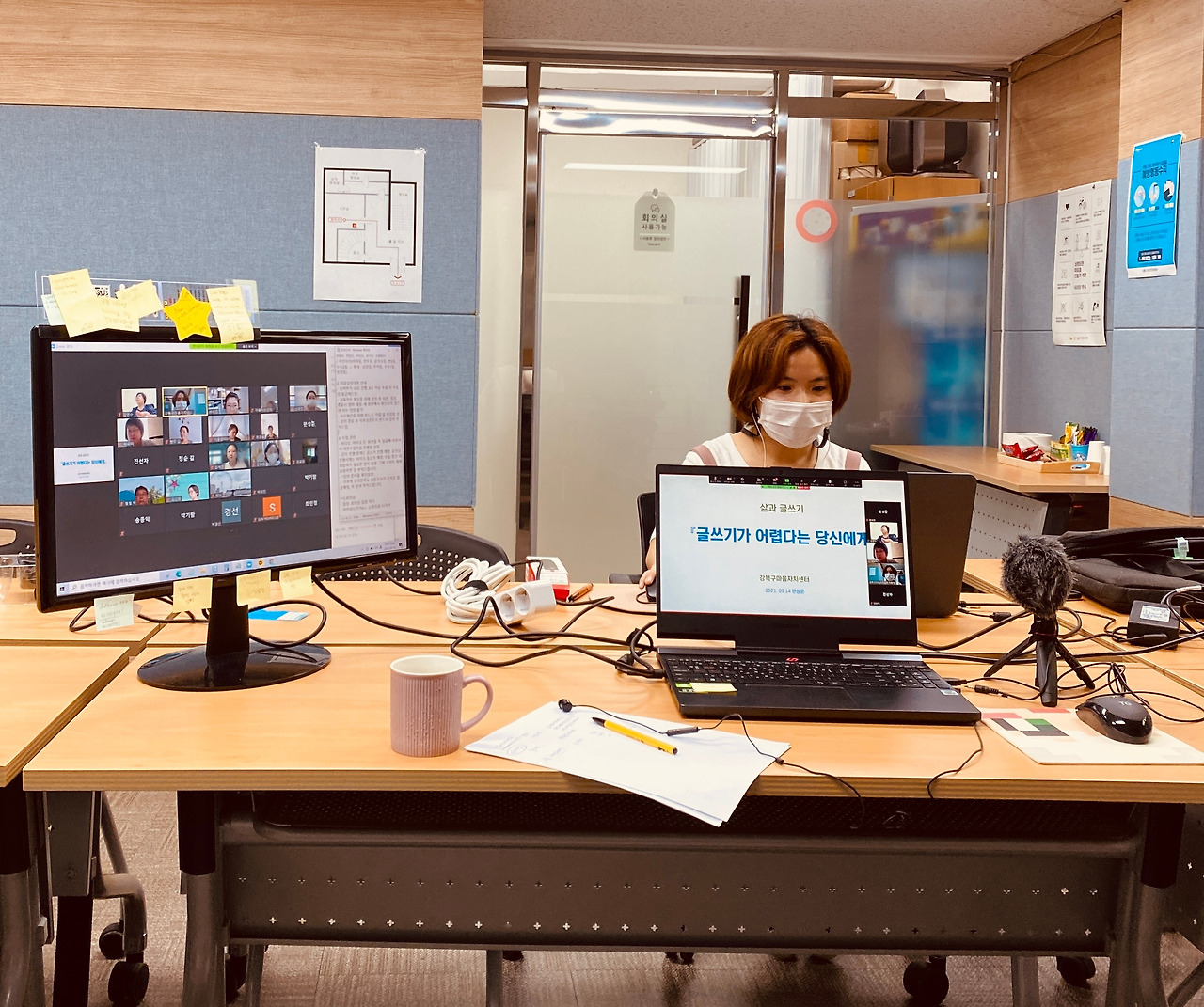 제가 아침 9시 반 정도에 센터로 가보니 청소업체 분들이 사무실을 청소하느라 분주한 모습이었고 한쪽에서는 센터 직원들이 업무를 보고 계셨습니다. 이은해 쌤이 줌 시스템을 준비해 주면서 평소 글쓰기에 관심이 있는 분들이 30명 정도 오실 거라고 하시길래 약간 긴장도 했으나 막상 화면을 통해 얼굴들을 한 분 한 분 뵈니 하나같이 선량한 모습이라 편하고 즐겁게 강의를 할 수 있었습니다.