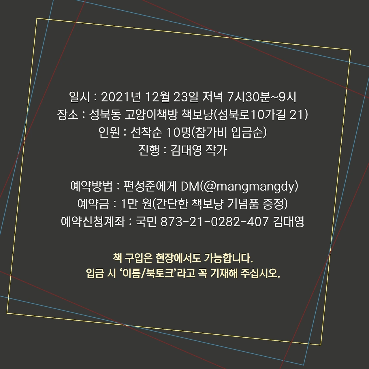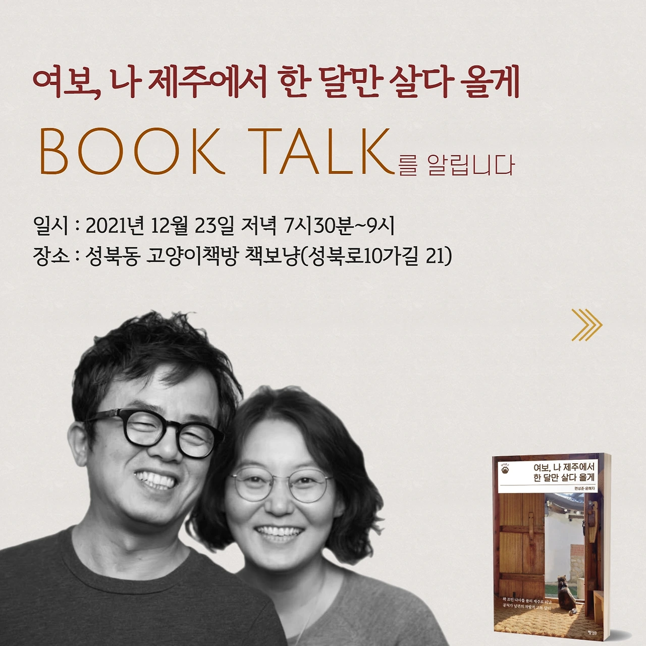 이번에 나온 책 『여보, 나 제주에서 한 달만 살다 올게』는 <냥이문고> 시리즈니까 고양이 책방에서 북토크를 여는 게 여러모로 어울리는 것 같습니다. 마침 성북동엔 고양이에 미친 김대영 작가의 책보냥이라는 책방 겸 카페가 있습니다. 12월 23일 저녁 7시 30분부터 몇몇 독자를 모시고 윤혜자·편성준 두 저자가 제주와 고독에 대해 이런저런 수다를 떨어볼 생각입니다. 이번 북토크는 별도의 PPT 없이 간단한 메모만 들고 하는 캐주얼한 시간이 될 것 같습니다. 꼭 저희가 아니더라도 책보냥이라는 공간이 아주 많이 예쁩니다. 그러니 많은 분들의 참여...... 아니구나, 선착순 열 명만 모시겠습니다. 입금 순으로 명단 작성합니다(책은 현장에서도 구매하실 수 있습니다).