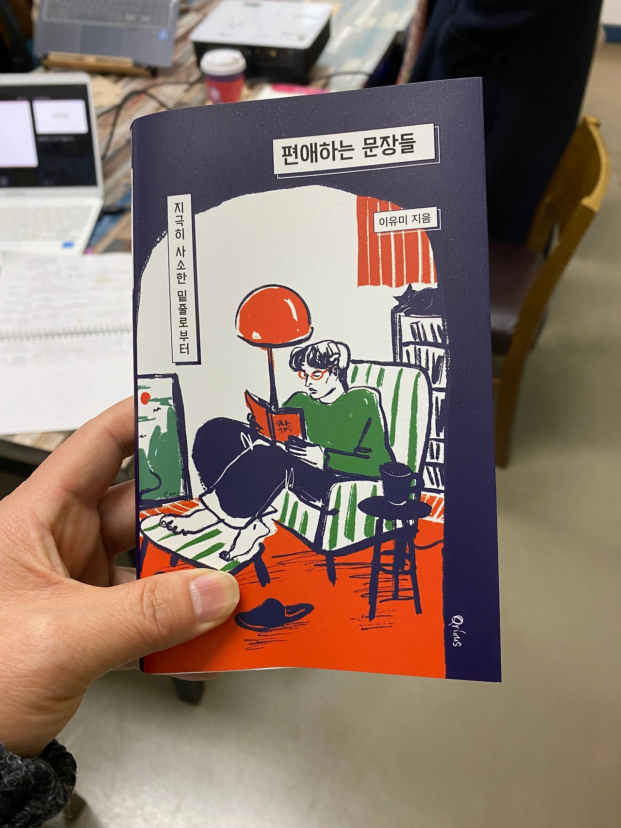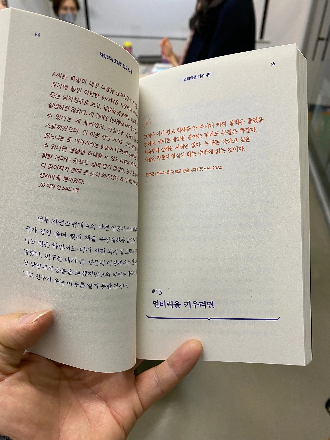 책은 이유미 작가의 『편애하는 문장들』이었고 <멀티력을 키우려면>이라는 소제목에 『부부가 둘 다 놀고 있습니다』에서 발췌한 제 글이 쓰여 있었습니다. ‘처음부터 잘하는 사람은 없으니 누구든 잘하려면 꾸준히 열심히 하는 수밖에 없다’는 다소 뻔한 내용이었습니다. 아름다운 글도 아니고 멋진 내용도 아닌 평범한 문장이었지만 생각지도 못한 곳에서 마주치니 이게 무슨 일인가 싶었습니다. 더구나 저는 조금 전까지만 해도 그 책의 존재도 몰랐고 읽어볼 생각도 안 했었으니까요.