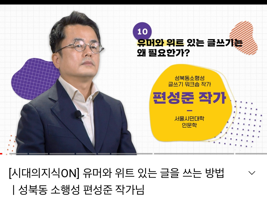 서울시민대학에서 글쓰기 강연을 한 이후 시민대학 내부 담당자분들의 추천으로 유튜브 강의도 하나 찍었습니다. 12월 22일에 업로드되었는데 이제야 알게 되었네요. 글쓰기와 인문학에 관한 내용이었으면 좋겠다는 담당 PD님 의견에 따라 '유머와 위트 있는 글쓰기의 가치'애 대해 강연을 했습니다. 원래 15분 분량이라 듣고 찍었는데 만들고 나니 10분 정도 되더군요. 담당 PD의 취향인 것 같은데 편집 속도가 너무 빨라 마치 긴 예고편을 보는 느낌입니다. 글쓰기에 관심 있는 분들은 시간 날 때 한 번 휘리릭 봐주시기 바랍니다.