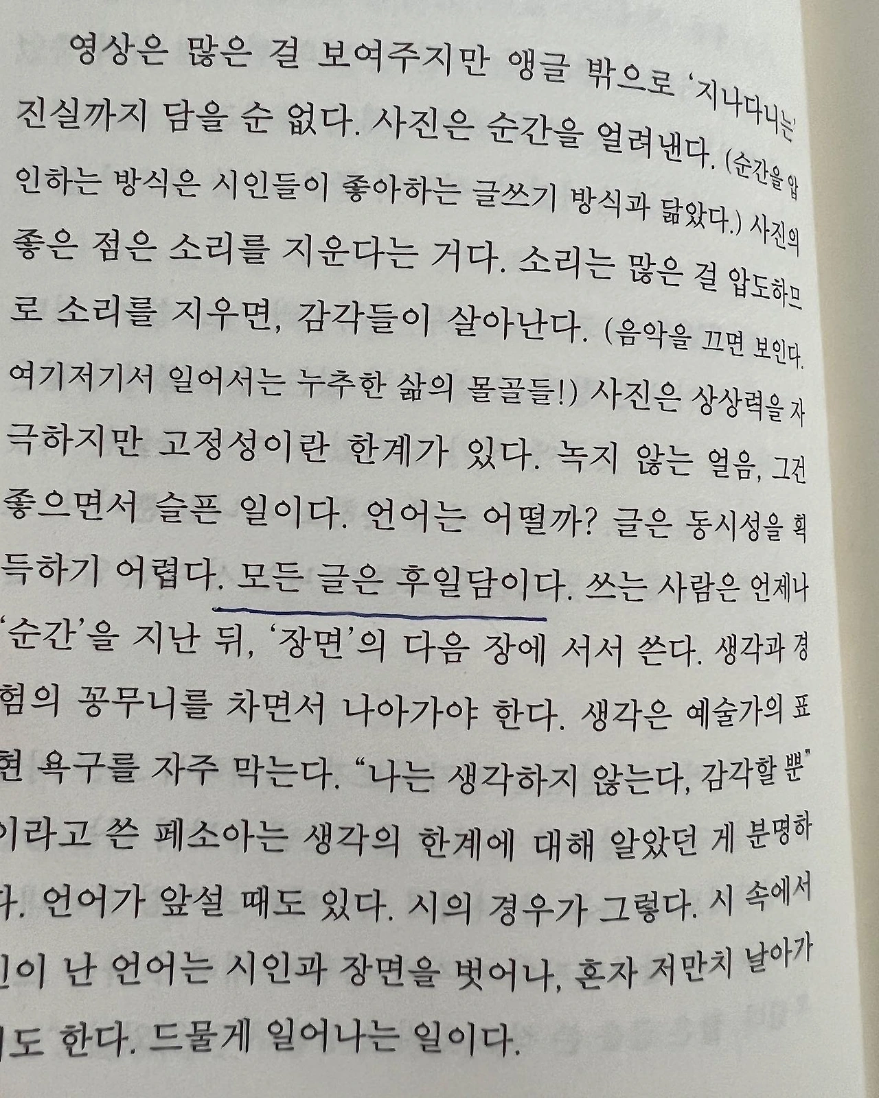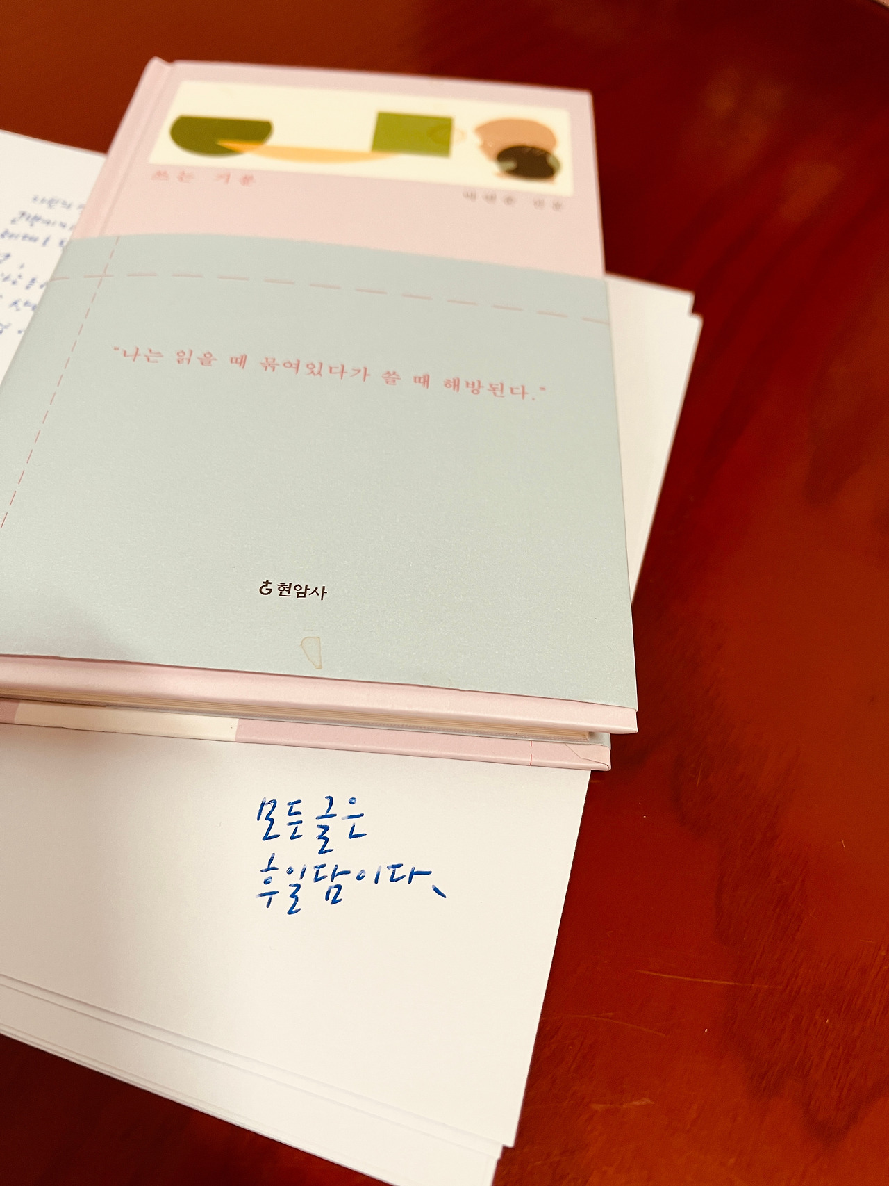 글을 쓰다가 막히거나 막막해지면 다른 책을 펼쳐 읽는다. 책상 위엔 충청북도교육도서관에서 빌려온 글쓰기 책들이 몇 권 있지만 오늘은 집에서 가져온 박연준 시인의 『쓰는 기분』을 펼쳤다. 예전에 줄 치고 메모해 놓은 페이지들을 찾아 읽다가 '모든 글은 후일담이다'라는 문장에 눈길이 갔다. 이상하게 위로가 되었다. 그렇지. 모든 글은 후일담이지.