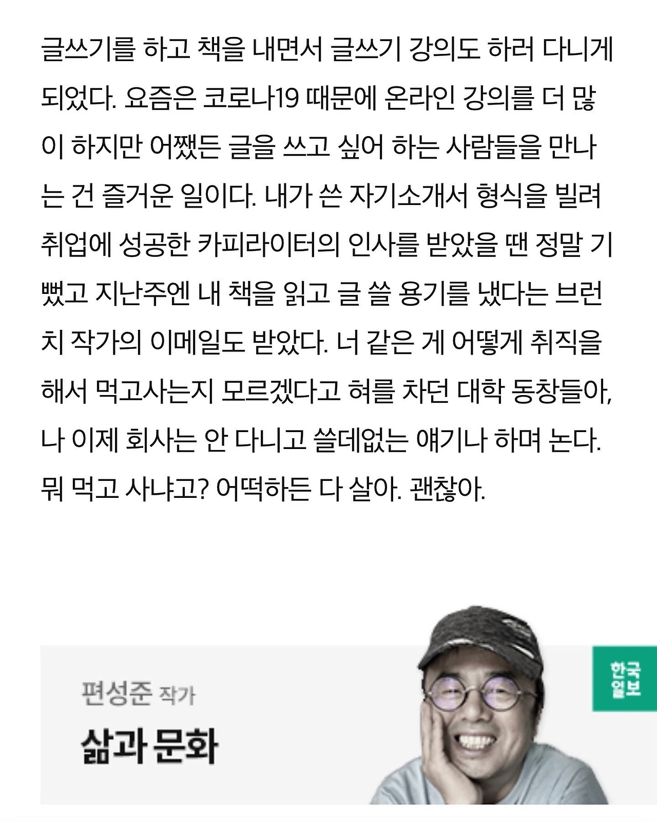 첫 칼럼은 광고회사 다니다 그만둔 얘기, 쓸데없는 얘기나 하며 사는 행복에 대해 썼습니다(원제는 ‘쓸데없는 얘기를 해도 되는 행복’이었습니다). 한 달에 한 번 씁니다.