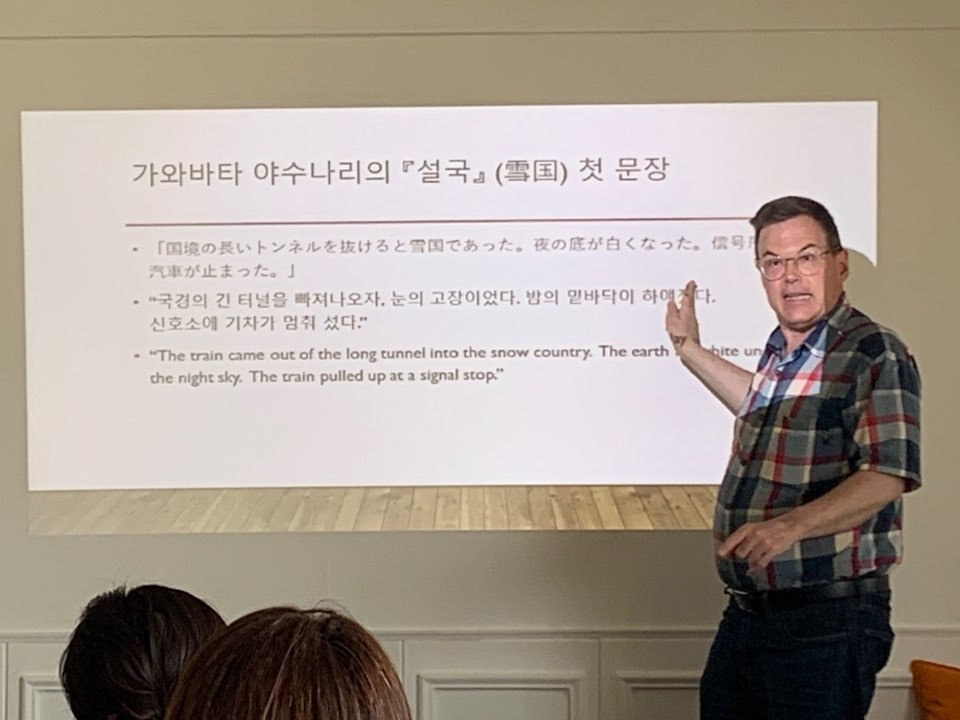우리는 한글로 먼저 읽어 그 뜻을 파악하고 일어, 영어로 된 문장들을 차례로 살펴보았습니다. 파 교수님이 뭔가 번역에 이상한 게 없느냐고 물으니 당장 '눈의 고장'이라는 표현이 어색하다는 반응이 튀어나왔습니다. 국경이라는 말의 뜻도 애매하다는 질문이 이어졌구요. 파 교수님은 일단 에도시대에 막부 별로 나뉘어 있던 일본 지역의 역사를 이해해야 '국경'의 뜻을 더 잘 이해할 수 있다는 점을 비롯해 '밤의 밑바닥이 하얘졌다'라는 표현이 어떤 풍경을 얘기하고 있는지에 대해서도 설명을 했고 그런 저런 사정들을 생각하면서 다시 한번 읽어보면 우리말이나 일어에 비해 영어로 된 문장에서는 '드라마'가 사라지고 건조한 묘사만 남는 특징이 있음도 지적했습니다. 이는 번역 언어로 사용될 때 각각의 언어가 갖는 기본적인 태도에 대해서도 방향성을 가늠할 수 있는 좋은 예였습니다. 파 교수는 '밥상이 들어왔다'라는 문장이 영어로 번역될 때는 과연 어떤 문장이 되어야 하는가를 물어서 모두들 웃음을 터뜨렸습니다. 영어로 하면 식탁이 방으로 걸어 들어가는 모습이 연상되어서였죠. "형이 술을 천천히 마셨다."라고 말할 경우도 형을 'Brother'라고 써야 할지 'hyeong'이라고 써야 할지 고민되는 지점이었습니다. 그러면서 [채식주의자]를 번역한 Deborah Smith의 '오역 논쟁'에 대해 얘기를 꺼냈습니다.