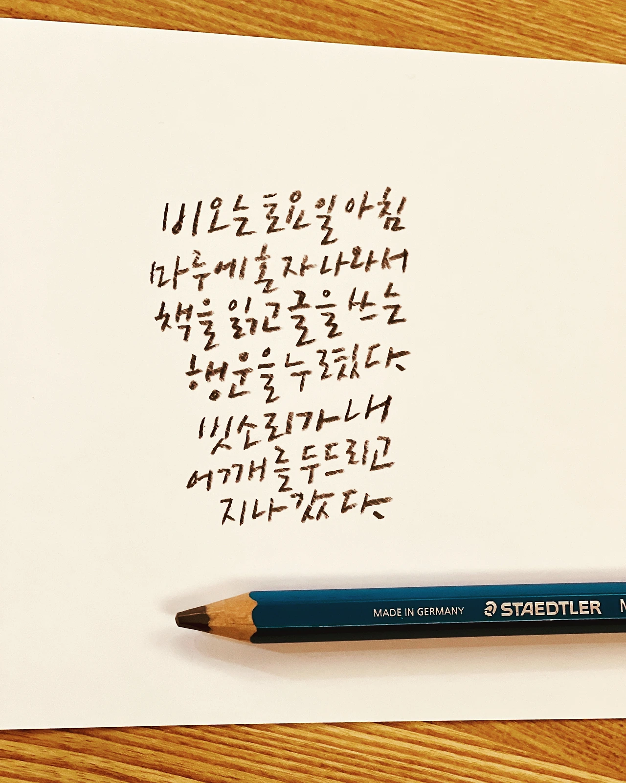 독후감을 다 고치고 써야 할 원고를 조금 더 쓰다 보니 비 오는 토요일 아침에 이렇게 고요하게 혼자 앉아 책을 읽고 글을 쓸 수 있다는 것도 참 큰 행운이라는 생각이 들었다. 종이와 펜을 꺼내 그 생각을 캘리그라피로 써보았다. 펜글씨가 마음에 들지 않아 연필로 바꾸었다. 얼마 전 교보문고 광화문점에 갔다가 산 굵은 스태들러 연필을 꺼냈다.