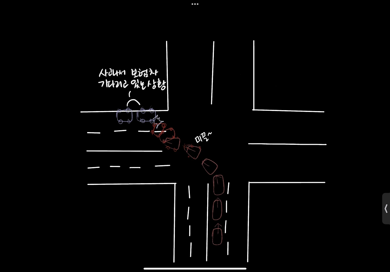 “아니.. 헤헤.. 거기 큰 사거리에서 분명히 속도도 줄이고 갔는데 차가 미끄러지는 거야. 그래서 브레이크를 밟으니까 더 쭈욱 미끄러져서..”