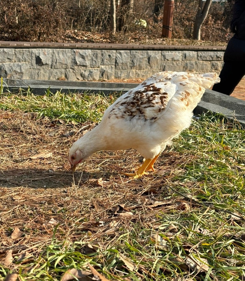 김치가 그 귀염귀염한 발로 사뿐사뿐 단지 내를 걸을 때면, 평소라면 그저 우리를 스쳐 지나갔을 이웃 주민들이 충격을 먹은 듯한 표정으로 발걸음을 차례로 멈춘다. 도심에서, 그것도 아파트 단지 내를 산책하고 있는 '살아있는 닭'을 볼 일이 없으니 당연하기도 할 테다. 도시인들에게 닭은 그저 주말 밤 엘리베이터에서 풍기는 달콤한 치킨 냄새로 친숙한 존재이니, 완연한 깃털로 덮인 채 닭벼슬을 세우고 있는 닭이 일상의 공간을 걸어 다니고 있는 모습은 사뭇 낯설고 놀랍기도 할 것이고. 김치와 함께 나서면 지나다니는 사람들이 수군거리며 우리를 쳐다보겠다는 생각은 했었다. 그런데 실제 우리가 접한 상황은 상상했던 그 이상이었다.