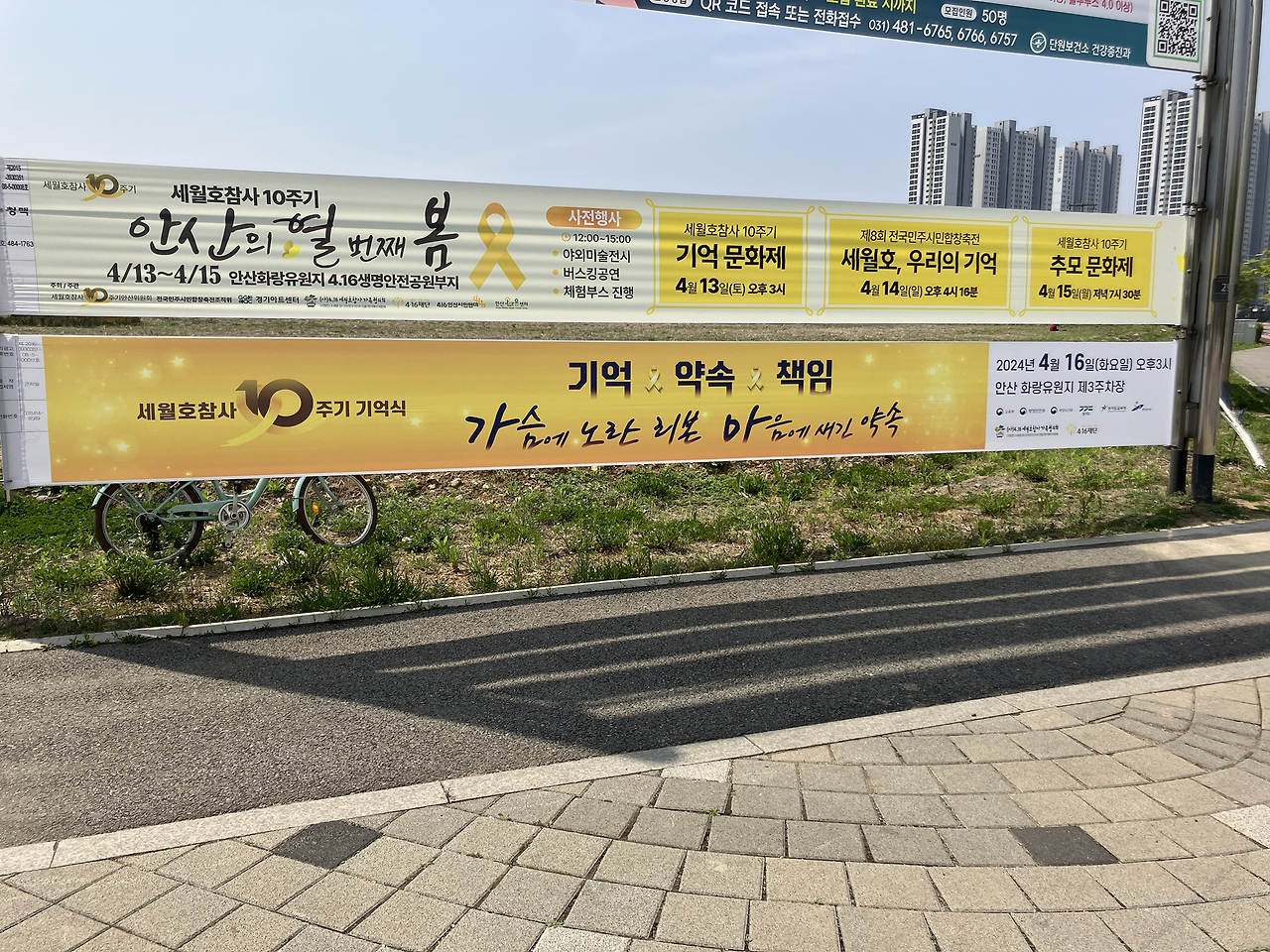 동네 길가에 지천으로 널린 개나리꽃의 노랑은 그저 어여쁘기만 한데, 안산의 봄이 품고 있는 색채는 슬프고도 아련하다. 길을 걷다 마주친 구청간판과 현수막마저 마음을 아리게 한다.