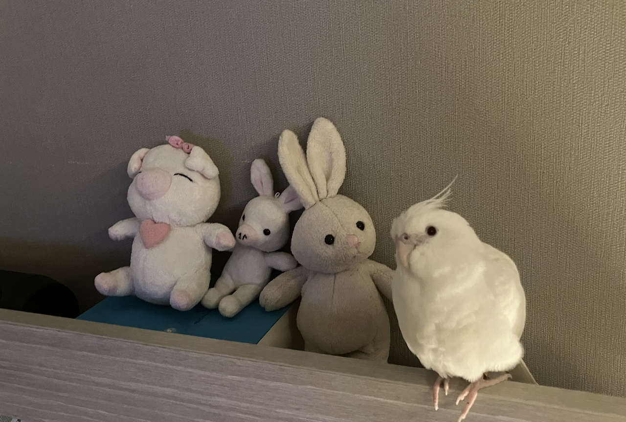 사진 속 토끼 인형이 어쩐지 두부에게 말을 걸고 있는 것 같네요. 짝꿍은 조금 섬뜩한 느낌도 든다고 하지만, 제 침대 머리맡 인형 친구들과 잘 어우러지는 두부 모습이 넘나 깜찍하고 어여쁩니다. 자기도 그걸 인지하고 있는 건지, 여기가 이제 두부의 최애 스폿이 되었어요.