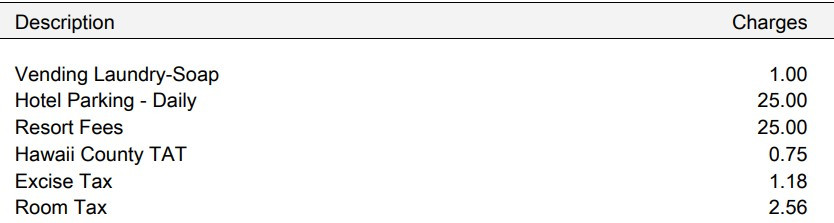 코나의 리조트에서, 방값을 제외하고, 추가로 정산한 내역.