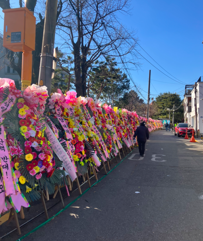 여기는 어제 헌법재판소 인근 골목길 풍경입니다. 한 치의 빈틈도 없이 벽을 따라 줄지어 서 있는 화환들이 눈길을 사로잡았습니다. 본디 누군가를 축하해 주기 위한 꽃송이들이, 충격적일 만큼 끔찍하게 다가올 줄 예전엔 상상조차 하지 못했어요. 벽처럼 단단히 자리 잡은 채 보행자들의 시선을 고통스럽게 만든 이곳이 마치 꽃의 무덤처럼 느껴졌습니다. 그것도 잔인하게 처단된 채로, 생명을 잃었지만 살아있는 듯 박제되어 버린 꽃들의 무덤이요. 평소라면 아름답게 느껴졌을 화사한 빛깔들이 섬뜩하게 느껴지게 만든 건, 그 꽃들 주변에 피비린내 나는 칼날처럼 서려있던 글귀들 때문입니다. 국민들을 향해 총부리를 겨눈 자를 다시 본디의 자리로 돌아오라고 응원하는 글귀들이요. 사람을 살리기도 하는 글은 그만큼, 어쩌면 그 이상으로, 사람을 고통스럽게 만들 수 있는 것이겠지요. 나는 앞으로 어떤 글을 써야 할까, 생각에 잠기게 만든 장면이었습니다.
