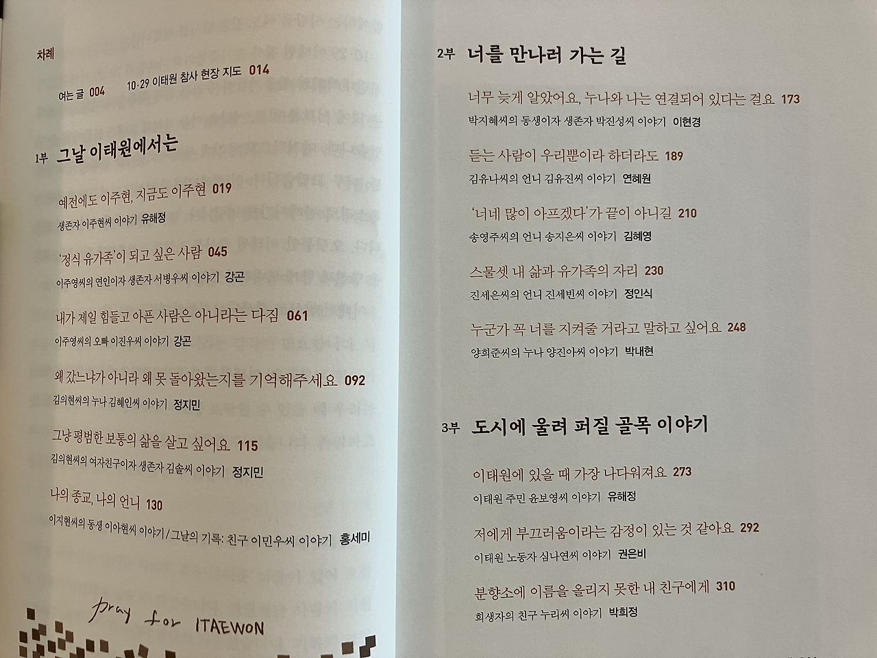 책의 마지막 장을 덮으며 확신하게 된 사실은, 지금 우리가 처해 있는 말도 안 되는 비정상적 상황은 이미 2022년 10월 29일 이태원의 그 밤 시작되고 있었다는 것입니다. 선 채로 압사당한 희생자들에 대해 ‘뇌진탕’으로 인한 사망을 의심하던 자와, 너무도 명백한 사인을 두고서도 ‘약물’로 인한 사망 가능성을 염두에 둔 듯 시신을 부검해야 한다, 라며 유가족의 동의를 유도하려 했던 공권력의 악의적 행태는, 지난해 12월 3일 부정선거 운운하며 국회와 선관위를 장악하려 들었던 이들의 모습과 결코 다르지 않았습니다. 이태원 참사의 근본적 원인이 제대로 밝혀졌다면, 그리하여 책임자들이 제대로 된 처벌을 받았더라면 지금의 극단적 상황으로까지 치닫지 않았을 것입니다. 이 땅에 더 큰 불행이 닥치지 않게 하기 위해서는, 헌법을 유린하며 우리 사회의 시스템을 붕괴시키는 자들을 이제라도 확실히 단죄하여야 할 것입니다. 어쩌면 이번이 우리에게 남은 마지막 기회일지도 모르겠습니다.
