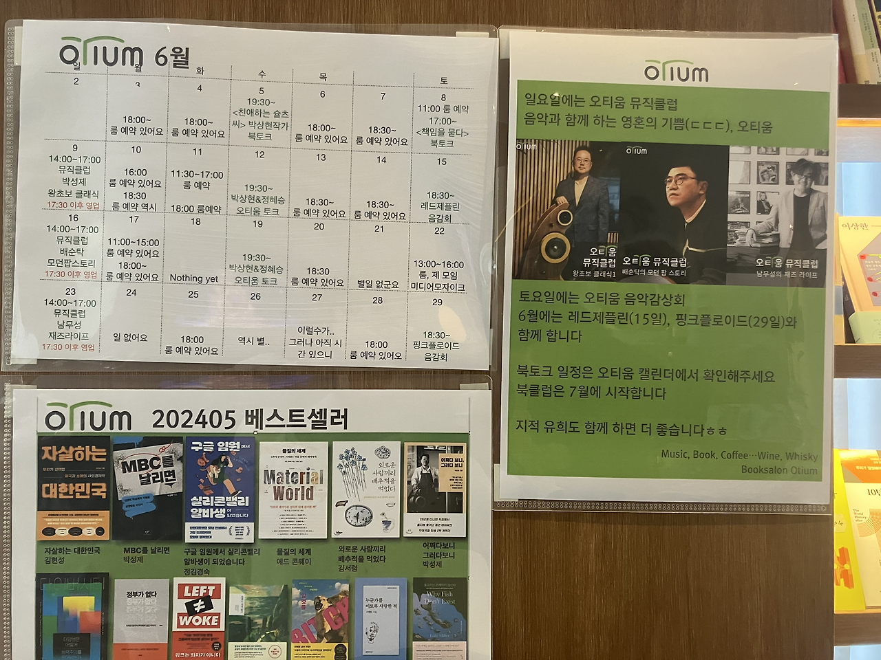 커피 한 잔을 곁들여, 비치된 샘플북들을 들여다 보고, 책을 구매했던 첫 방문 이후로, 지난 수십 년간 기념비적이었던 대중음악을 훑었던 개업 1주년 기념행사, 클래식 음악 감상회와 북토크에 이르기까지, 우리는 오티움에서 평소 경험하기 쉽지 않았던, 다채로운 행사를 즐기고 있다. 특히, 지난 5월 오티움에서 열렸던 음악 감상회에서는 우리나라 젊은 피아니스트의 대표 격인 조성진, 임윤찬, 손열음의 공연을, 주인장이 직접 제작한 스피커를 통해 감상하는 시간을 가졌는데, 무아지경으로 이끄는 황홀하고 스펙터클한 사운드 덕에, 콘서트 현장에서 연주를 감상하는 듯한 착각에 빠질 정도였다. 클래식 음악에 온몸이 흠뻑 젖어들도록 몰입해 있다가 귀가하던 봄밤의 발걸음에는, 일주일 간의 고단한 일상으로 덕지덕지 붙어있던 묵은 때들이 말끔히 씻겨나간, 한결 가벼워진 리듬이 실렸다.