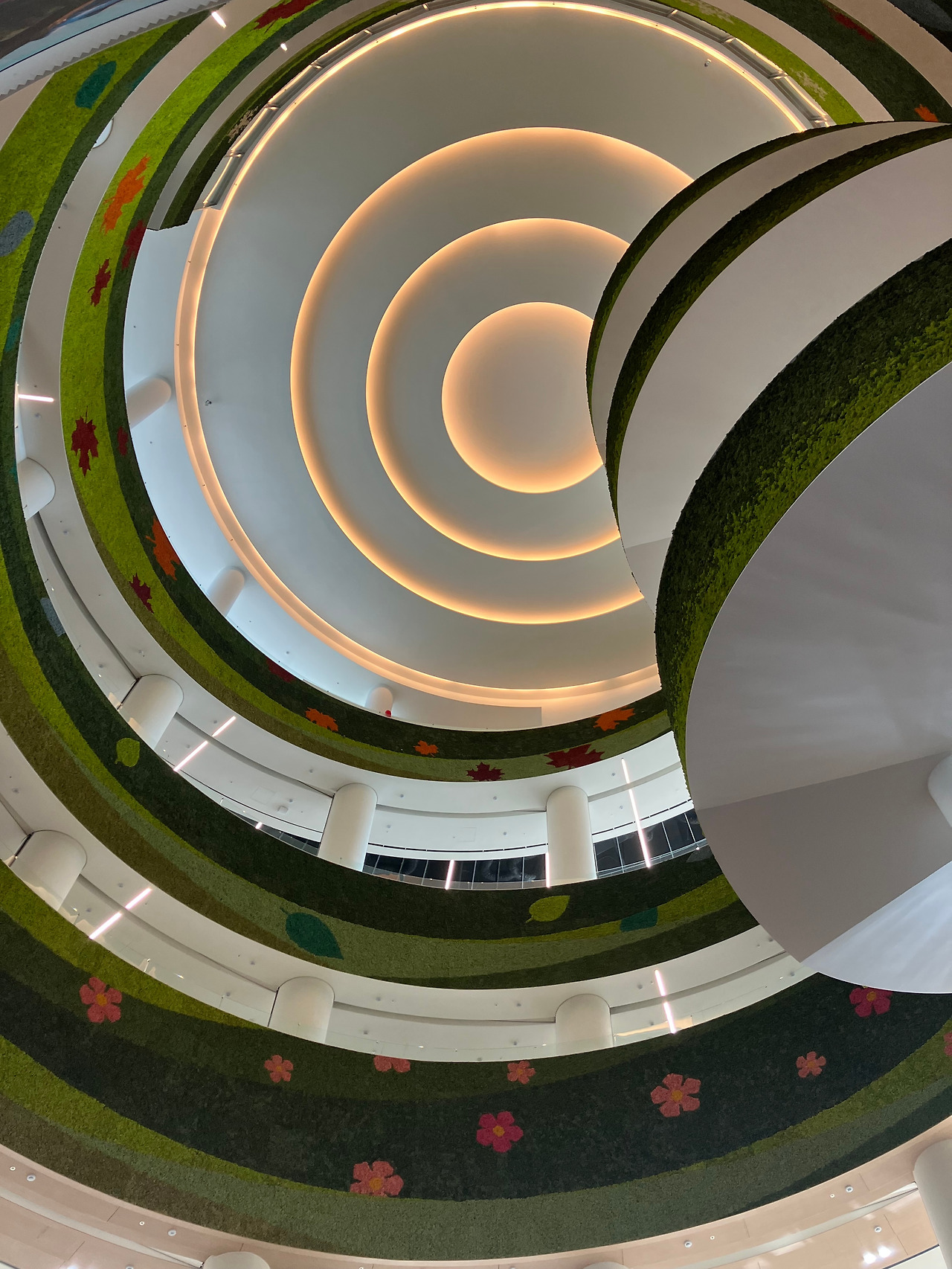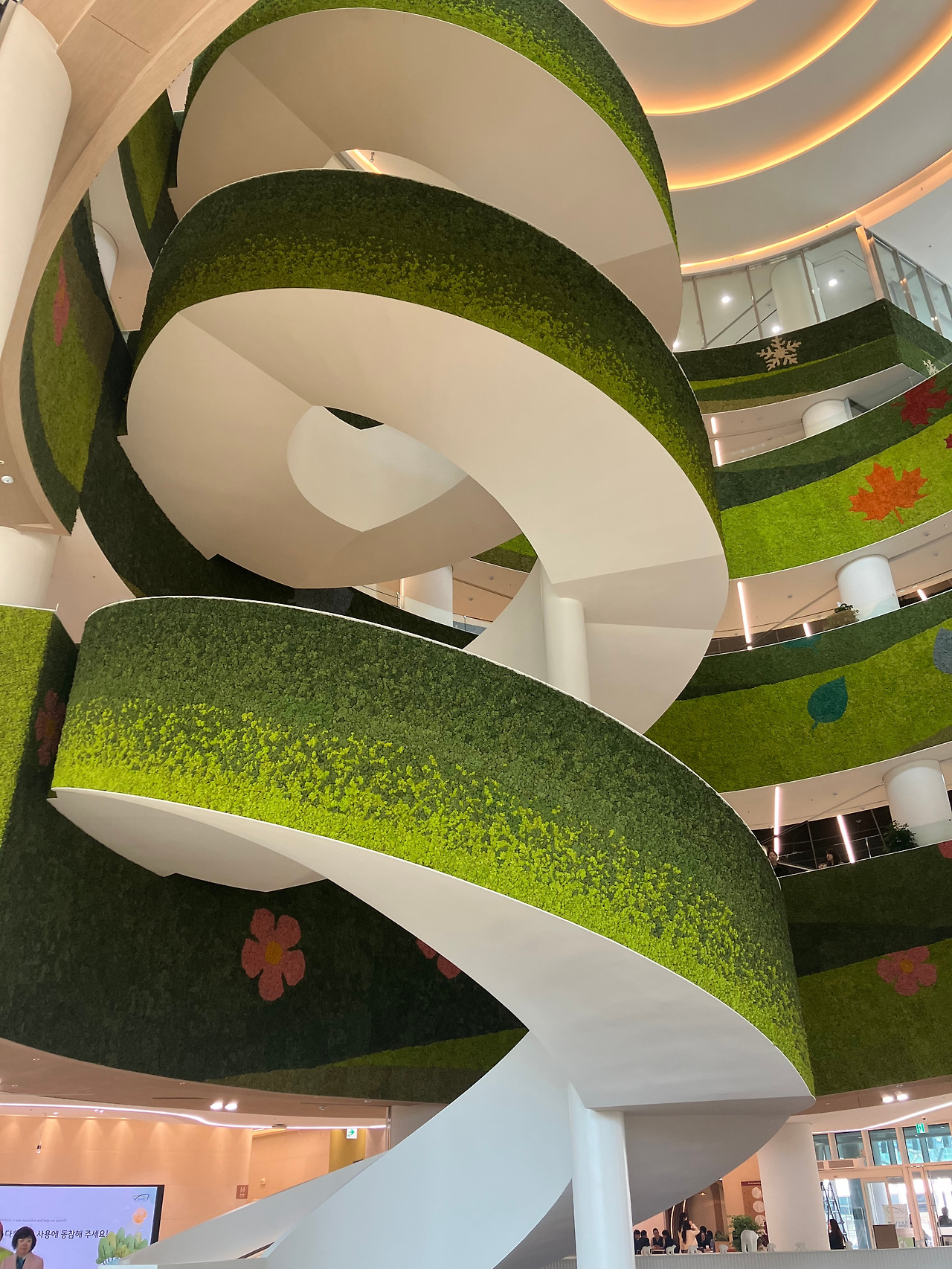 도서관 관련 소식에 안테나를 세우고 있다 보니, 경기도서관이 문을 연다는 사실을 일찍이 알게 되었어요. 지난 10월 25일 광교신도시에 문을 연 경기도서관은 국내 지방자치단체 도서관 중 최대규모라고 합니다. 현재 소장하고 있는 장서들만 34만여 권(전자책 14만 8천여 권 포함)인데 점진적으로 늘려갈 예정이라고 하네요. 제가 무엇보다 경기도서관에 관심이 갔던 건, 경기도서관이 '열린 플랫폼'으로서 기능하겠다고 선언한 사실 때문이었습니다. 이는 경기도서관의 독특한 내부구조를 보면 알 수 있습니다. 지상 1~5층, 연면적 2만 7795제곱미터 방대한 면적을 자랑하는 경기도서관에는, 각 층이나 공간을 분리하는 (가)벽을 찾아보기가 어렵습니다. 거대한 나선형 구조로 연결되어 있는, 계단 같지 않은 계단을 오르다 보면, 내가 지금 있는 곳이 몇 층인지 아리송해지고, 층을 오르고 내려왔다는 감각도 거의 느껴지지 않아요. 마치 '이상한 나라의 엘리스'의 공간 어딘가를 걷고 있는 듯한 기분에 빠져드는데, 공간 전체를 아우르는 빛깔이 초록초록해서, 산뜻한 숲 속을 걷고 있는 듯한 느낌을 받기도 해요.