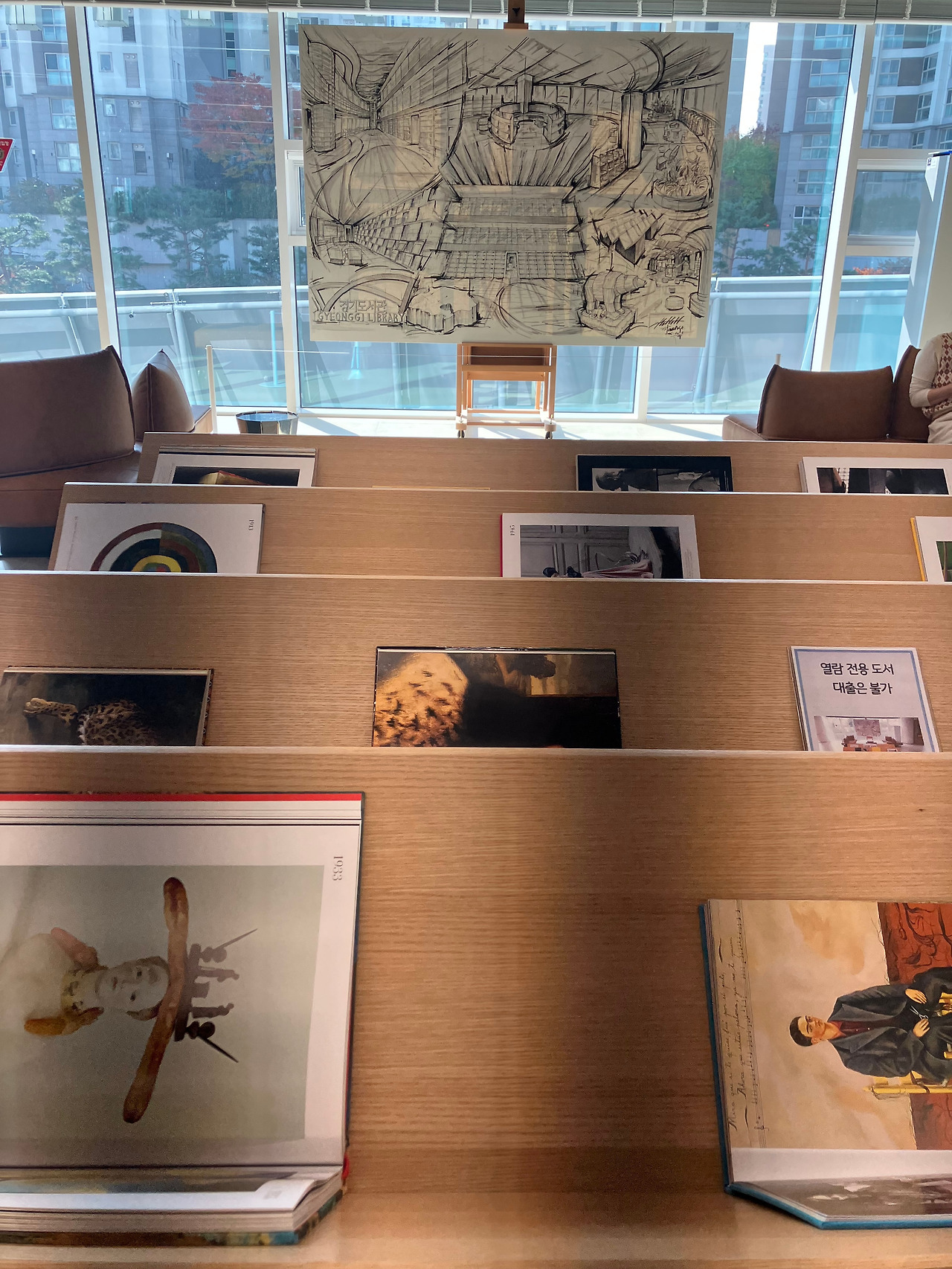 제가 짝꿍과 함께 경기도서관을 찾은 건 평일 점심 무렵이었어요. 그럼에도 근처에서 온 직장인들로 도서관은 붐볐습니다. 경기도서관 바로 뒤편에 경기도 신청사와 경기도교육청이 자리하고 있거든요. 한 가지 재미있었던 장면은, 도서관에 마실 나온 직장인들의 표정이었어요. 저와 짝꿍도 마찬가지였을 것 같긴 하지만, 그들의 얼굴에는 시골에서 갓 상경한 이의 얼굴에서 볼 수 있을 법한 표정이 떠올라 있었는데, 스스로는 전혀 인지하지 못하고 있는 것 같았어요. 상상해 보세요. 한 손에는 도서관 1층 카페에서 테이크아웃한 커피를 들고, 감탄하느라 살짝 열린 입술에 휘둥그레 해진 눈으로 주변을 연신 두리번거리는 직장인들을요. 얼마나 사무실로 돌아가기 싫었을까요. 그도 그럴 것이, 경기도서관에는 볼거리도 정말 많고, 휴식공간도 이보다 더 훌륭할 수없겠다 싶을 정도로 잘 갖춰져 있어요.