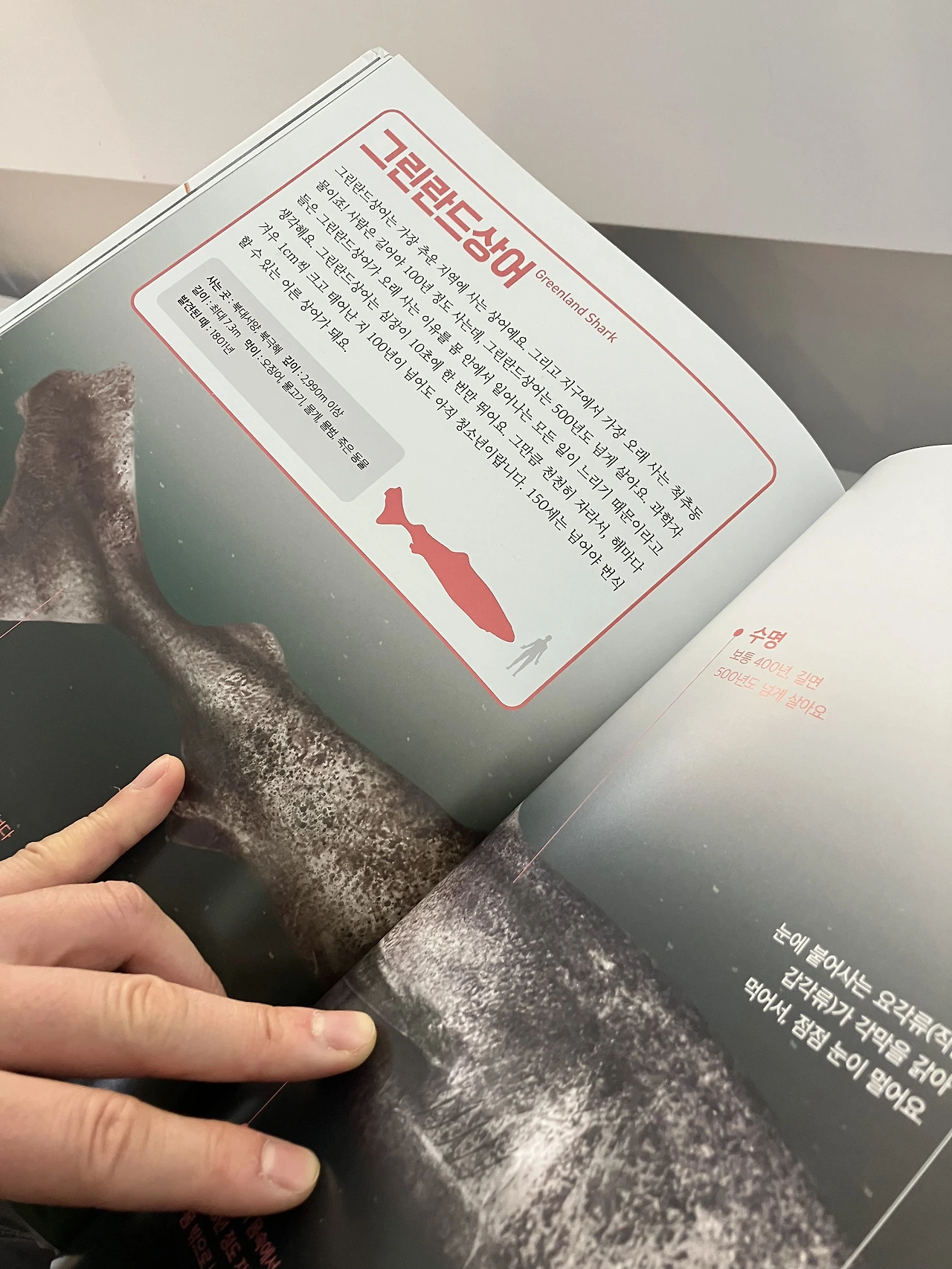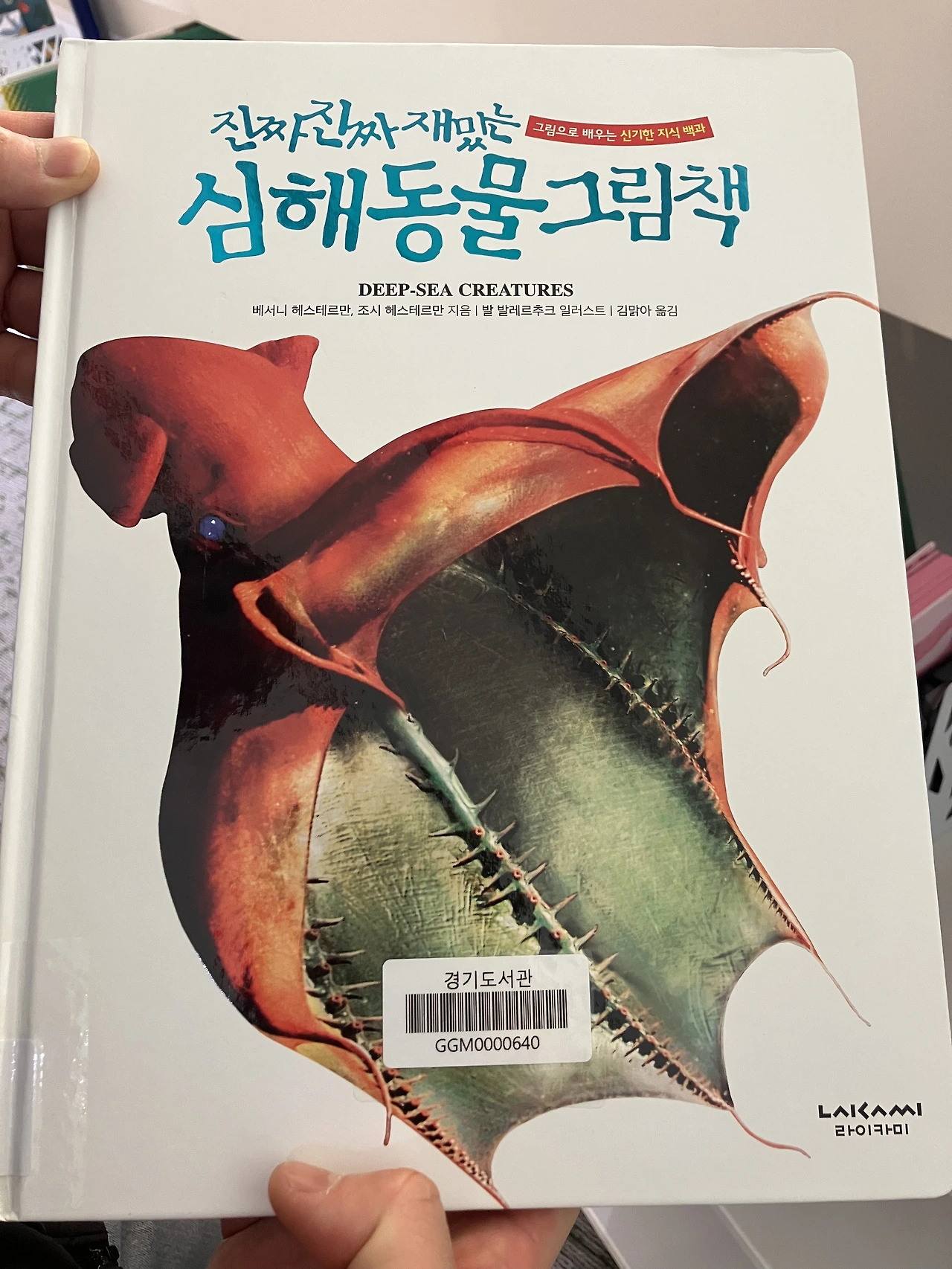 지역도서관에 자주 들러 책구경하는 것을 즐기는 편인지라, '새롭고 신기하다'라는 느낌을 받게 되는 책은 흔하지 않아요. 그런데 경기도서관의 어린이도서코너에서 아주 흥미로운 책을 발견했답니다. 여러분은 혹시 심해에도 많은 생명체들이 살고 있다는 사실을 알고 계시나요? 보통 '심해'라고 하면, 햇빛이 들지 않아 생명체의 광합성이 가능하지 않은, 수심 200미터 이하를 말한다고 해요. 100미터 전력 달리기의 출발선에서 보이는 결승선과의 거리마저도 아득하게 느껴지는 저로서는, 바닷속 200미터는 상상조차 하기 힘든 깊이로 다가오는데요, 무려 수심 3천 미터 이하에 사는 상어가 있다고 합니다. 이름하여 '그린란드상어'. 녀석의 수명은 자그마치 오백 년도 더 된다고 해요. 의아한 점이, 녀석이 최초로 발견된 때가 1801년이라고 하는데, 어떻게 수명이 오백 년 이상이란 사실을 알 수 있었을까 하는 것이에요. 탄소측정 같은 과학적 방법들이 동원되었으리라 어렴풋이 짐작은 가지만요.