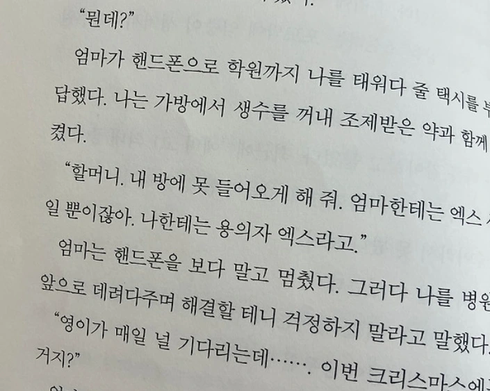 손녀의 사라진 이불은 할머니 방 옷장에 고이 모셔져 있었다. 나는 '이번이 마지막이다'라는 심정으로, 친정 엄마에게 먹히지도 않을 또 한 번의 잔소리를 한 후, 헬로키티 이불을 딸의 이불로 슬그머니 바꿔놓았다. 자신의 이불이 어디에 있었는지는 딸에게 함구한 채로. 그러고 난 후, 자꾸만 뛰어오르는 마음을 진정시키려 소설책을 집어 들었다. 마침 읽고 있던 작품이 청소년 소설이었는데, 몇 장을 읽어 내려가자니, ‘할머니 내 방에 못 들어오게 해 줘.’라는 대사가 내 눈을 활짝 뜨이게 했다. 소설이 나를 위로해 주려는 것일까. 당신만 그리 사는 건 아니니 슬퍼하거나 노하지 말라고. 그도 그럴 것이, 작품 속 손녀의 대사에는 할머니가 '용의자 엑스'로 등장하고 있었다. 어쩜 우리 집이랑 상황이 이다지 똑같을까! 일련의 반복되는 과정을 거치며 딸아이는, 본인이 없는 사이 방 안의 무엇인가가 바뀐 느낌이 들 때면 일단 할머니부터 용의 선상에 올린다. 이제는 중학교 일 학년인 아들램도 할머니를 용의자 X로 여기는 경우가 드물지 않게 발생하고 있다.