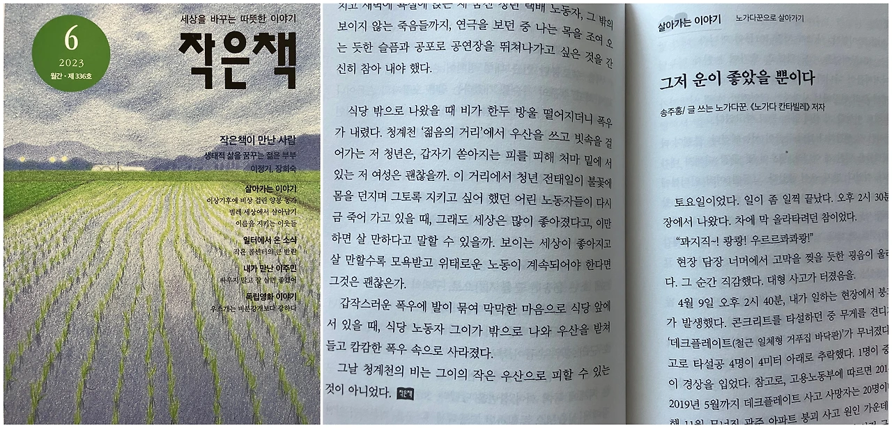 <작은책>을 읽다 보면 우리 사회에 실로 다양한 노동자들이 있으며, 그들이 꿋꿋이 버텨주고 있기에 이 사회가 지탱될 수 있다는 것을 새삼 깨닫게 된다. 노동자가 존중받지 못하고 있는 지금의 안타까운 현실이 이 잡지로 향한 애정을 더 강하게 만드는 것 같다. 우리 모두는 결국 노동자고, 그러므로 노동자가 업신여겨지는 사회는 결코 발전하지 못할 것이기에.