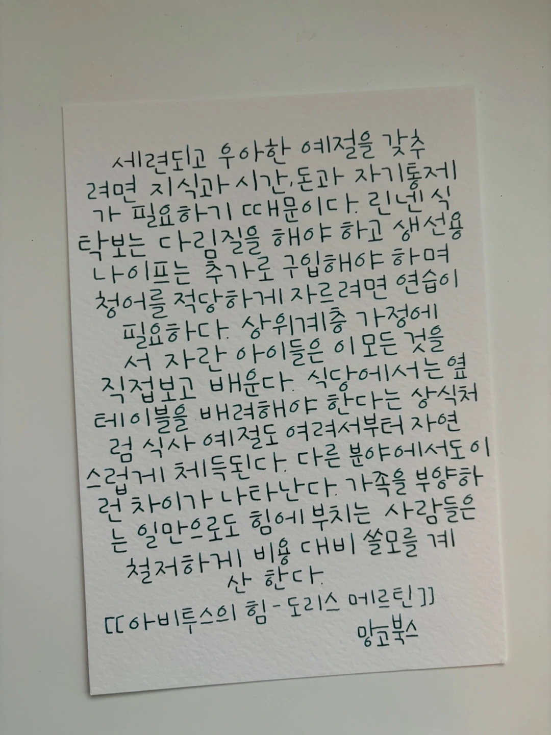 우리 집에서는 아이들이 학원 숙제에 쫓겨 밥을 급하게 먹고, 그 과정에서 예의를 차릴 시간조차 없었던 것 같습니다. 하루하루가 빠르게 돌아가다 보니, 저도 모르게 기본적인 식사 예절에 신경을 쓰지 못했어요. 고급 아비투스를 몸에 익힐 여유도 없었고, 그 중요성조차 간과하고 있었음을 그날 깨달았습니다. 둘째 친구의 행동을 보며, 무엇을 놓치고 있었는지 깊이 돌아보게 되었습니다. 일상의 작은 습관이야말로 아이들의 인성과 가치관을 형성하는 데 매우 중요한 역할을 한다는 사실을 실감하게 되는 날이었습니다. 그날 이후, 저는 후회와 함께 어떻게 우리 가정에서 더 우아하고 세련된 습관을 만들어 나갈 수 있을지 고민하기 시작했습니다.