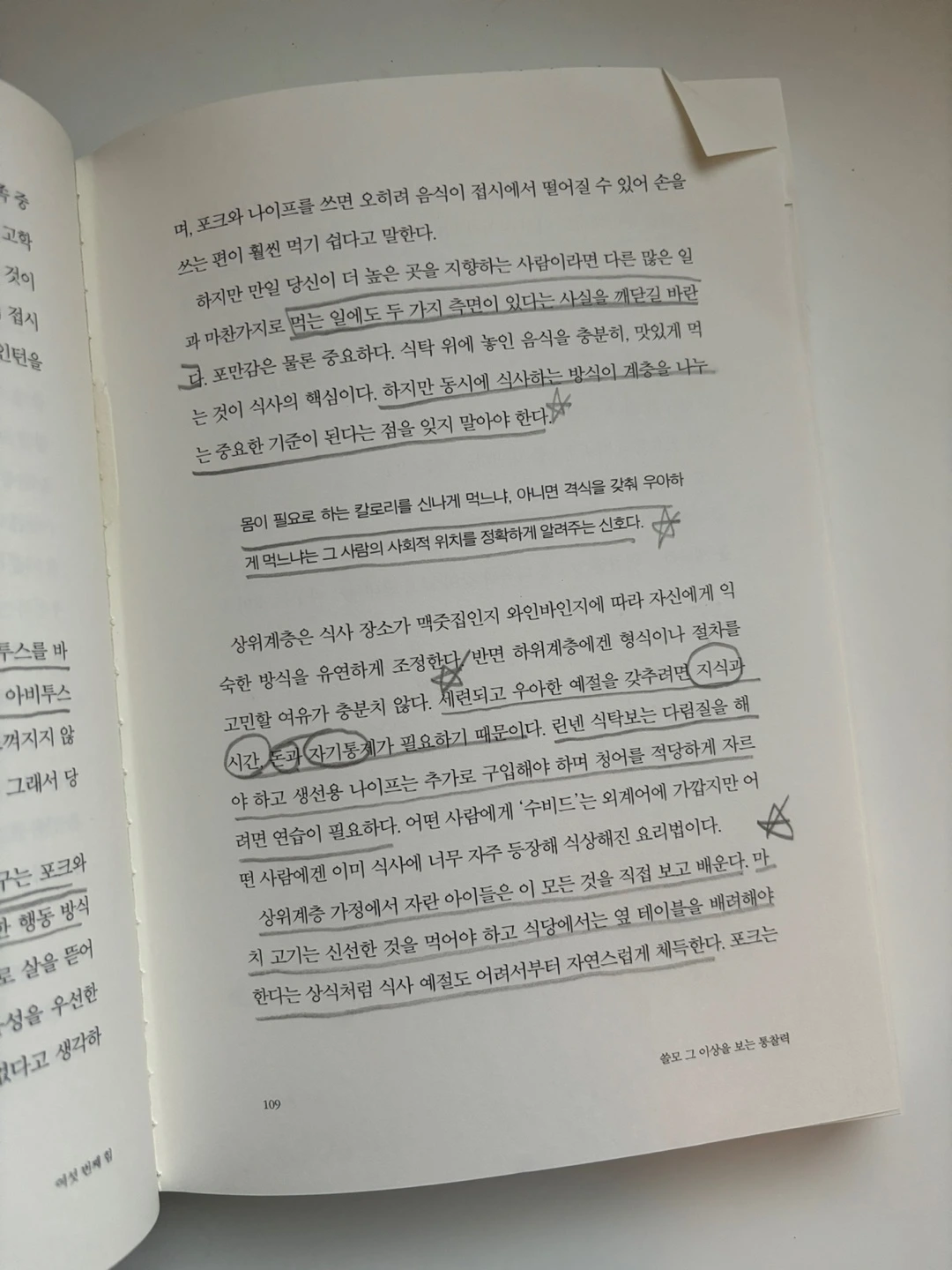 한 마디로 말하자면 아비투스란, 우리가 자라온 환경이 만든 습관과 태도로, 나를 타인과 구별 짓는 특징입니다. 아비투스 책을 먼저 읽고 아비투스의 힘을 읽고 있습니다. 아비투스 책은 올해 제가 읽은 책 중 베스트 3 안에 들 만큼 인상 깊었습니다. 다만, 처음에는 "상위 계층"이나 "사회적 지위" 같은 단어들이 반복적으로 나와 불편하게 느껴졌는데요, 형식적인 계급은 없어졌을지 몰라도 아직도 보이지 않는 계층은 여전히 존재하니까. '그래, 열받을 일 아니다' 하고 읽고 있어요. 발끈하는 거 보니 제가 상위 계층이 아닌가 보죠. ㅋ 불편한 단어에 중점을 두면 기분이 나빠 책을 덮어 버릴 수도 있지만, 그래도 우리는 상위계층이 가지고 있는 돈으로 살 수 없는 취향, 세련됨, 아우라.. 는 배울 가치가 있다고 봅니다. 이 책은 상위 계층 사람들에게 몸에 배어있는 아비투스를 평범한(or 책에서는 하위계층이라고 표현하지만) 사람들도 배우고 익혀서 내 것으로 만들자는 취지의 책이니, 마음 편히 보시길 바랍니다.