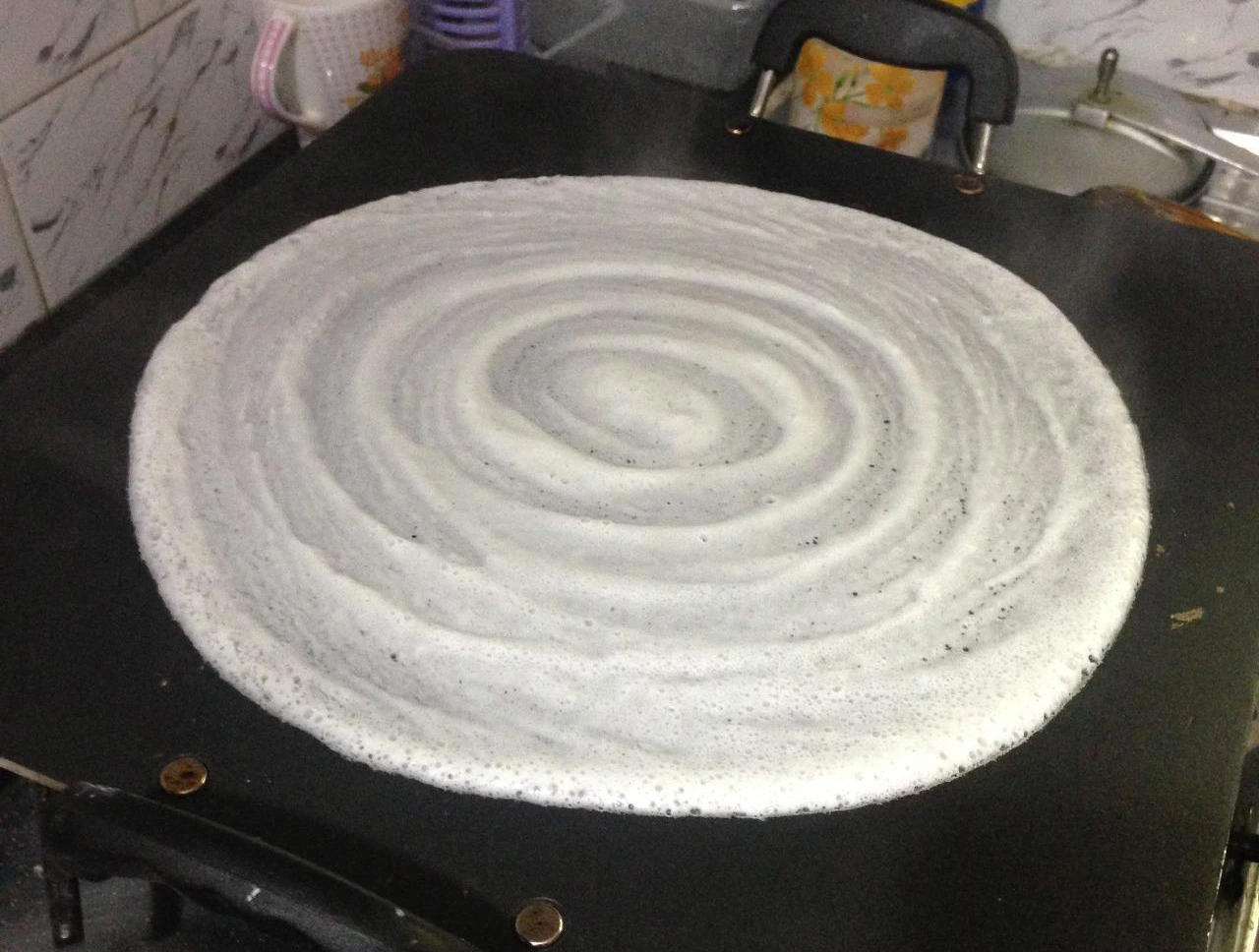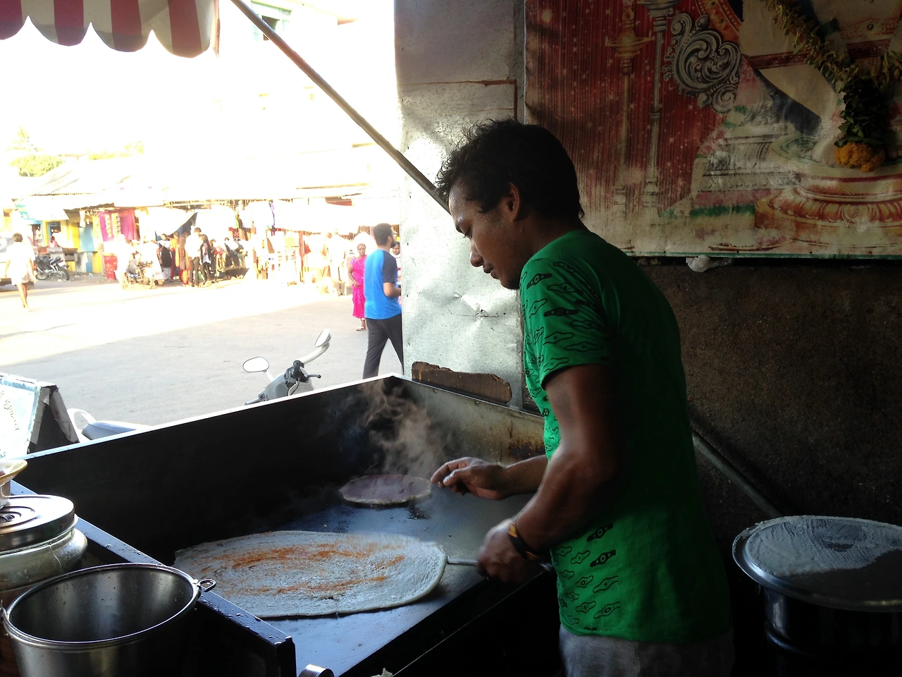 뭐니 뭐니 해도 마살라 도사의 하이라이트는 바로 커다란 판에 쌀가루 반죽을 얇게 부쳐서 '파다 다닥' 소리가 나도록 부치는 것이다. 보통 마살라 도사를 파는 식당은 사람들이 지나다니는 길거리 앞에 커다란 팬을 내놓고 만드는 경우가 많은데 쌀가루 반죽을 동그랗게 원을 그리며 크게 만드는 것만 보더라도 '저건 대체 무언인가' 하는 호기심과 함께 금방 그 모습에 매혹되어 '언젠가 한 번은 먹고야 만다'라는 굳은 결심을 하게 만든다.