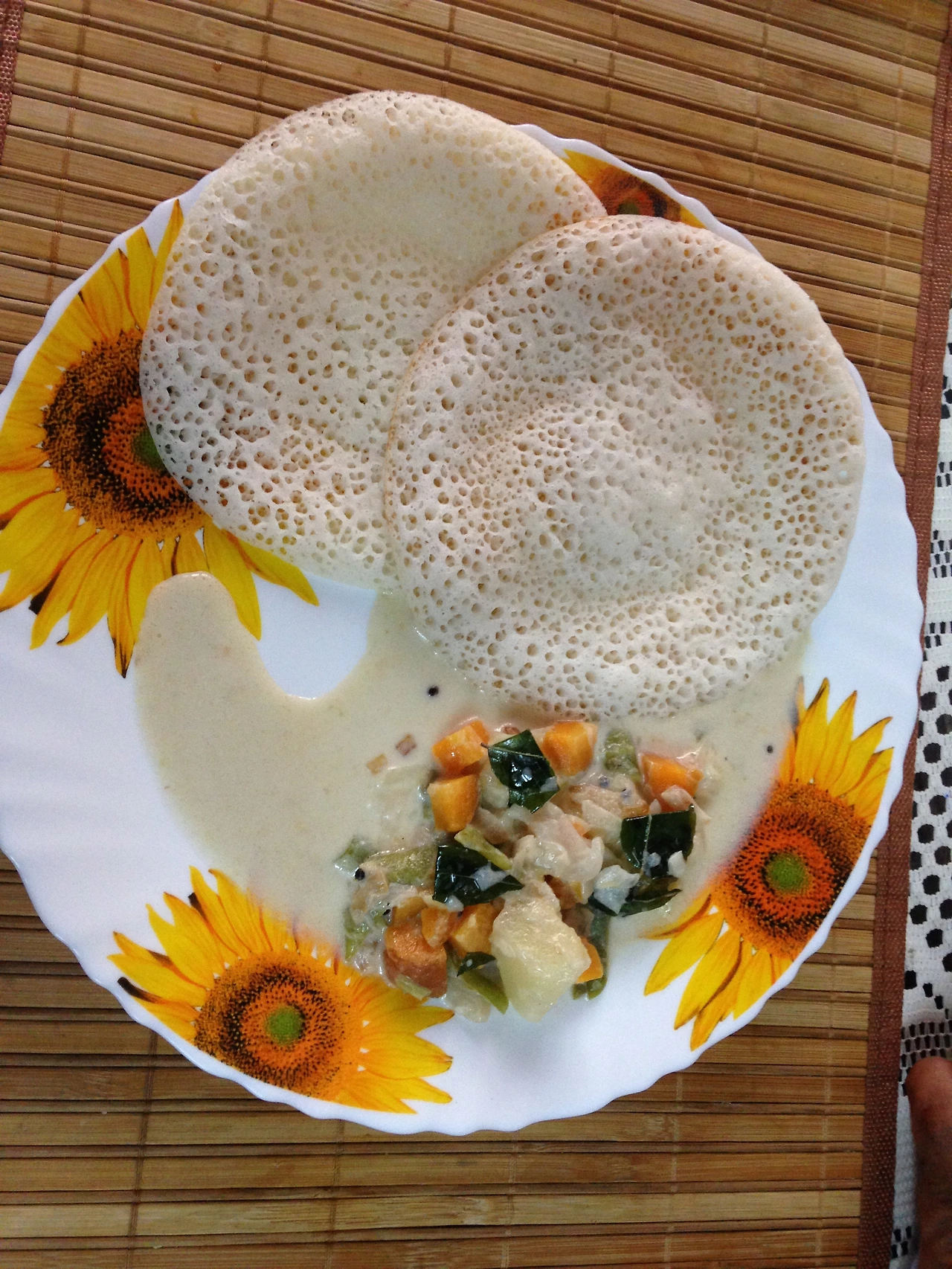 기름기 없이 수증기로 찐 쌀 팬케이크라고 할 수 있는 아빰. 방금 만든 뜨거운 김이 나는 아빰을 코코넛 밀크를 듬뿍 넣어 만든 야채 커리와 함께 하면 달콤한 맛이 정말 일품이다.