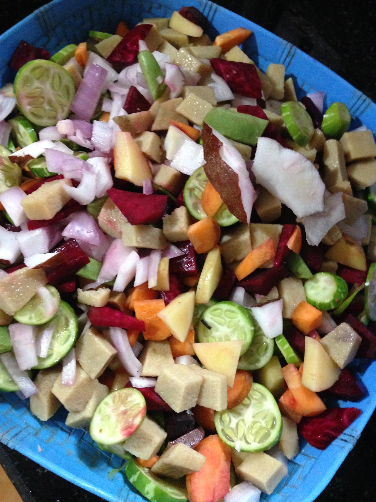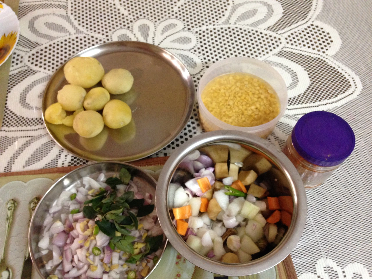 오늘의 재료는 마살라 도사 안에 들어갈 삶은 감자와 쌀가루와 렌틸 콩가루를 섞어 하룻밤 발효시킨 반죽과 인도 양념의 필수인 갖은 향신료 그리고 우리나라의 찌개 같이 야채를 푹 고아 끓이는 삼바(야채수프)에 들어갈 각종 야채들이 이미 썰어져 있었다. 요리를 하는 시간을 줄이기 위해 야채는 미리 손질을 하셨다고 한다.