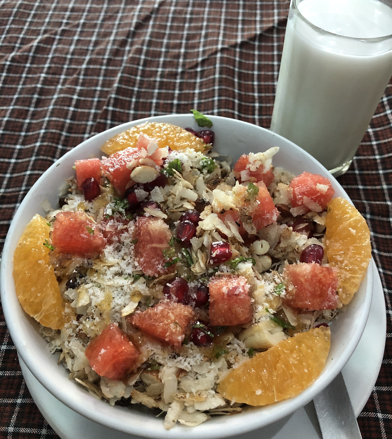 대부분의 학생들은 요가원에 머물며 숙식을 해결하지만, 혼자 있는 것을 좋아하는 나는 요가원 근처의 작은 게스트하우스에서 지낸다. 그래서 식사 시간에는 요가원을 빨리 빠져나와 걸어서 5분 정도 걸리는 작은 식당에서 식사를 한다. 리시케시에서 오래 알고 있는 친구가 하는 식당으로 아침 메뉴는 진한 블랙커피에 비건 오믈렛 (채식주의자들이 먹는 계란이 들어가지 않은 오믈렛으로 야채와 곡물을 섞어 만드는 부침개 같은 음식)이나 과일 샐러드를 번갈아가며 먹는다. 한 시간 안에 식사를 해결해야 하므로 요가원을 급히 나와 빠르게 걸어 식당 안으로 들어가 '무케시'하고 그의 이름을 크게 부르며 빨리 아침을 달라고 한다. 그러면 환한 웃음의 친절한 무케시는 그가 준비한 아침 식사를 재빠르게 내온다. 항상 '빨리빨리'를 외치는 내가 싫지도 않은지 그는 항상 '망고! 잘 잤어? 오늘은 기분이 어때?' 하며 음식을 내오는 그가 점점 좋아진다. 그의 웃는 얼굴을 보면 그냥 기분이 좋아진다.