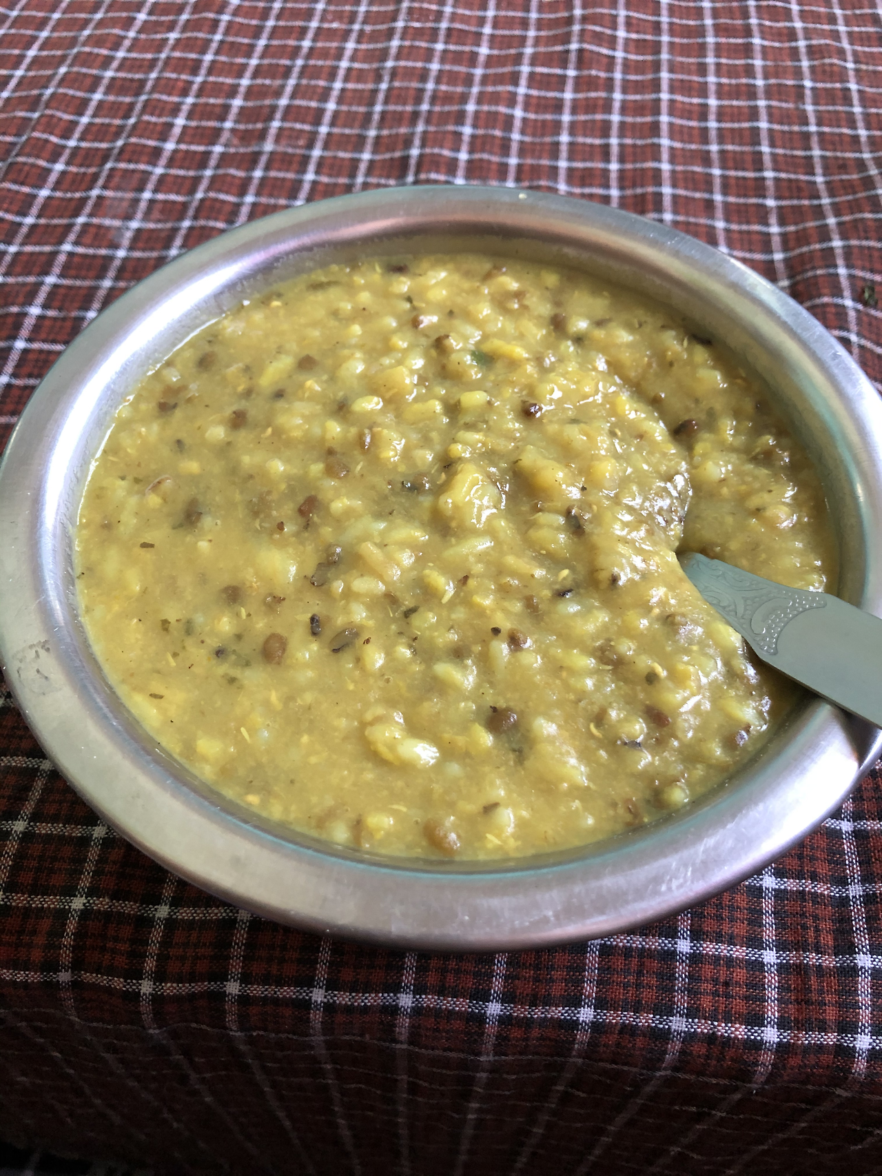 이렇게 요가원의 바닥에 마냥 앉아 있다가 보면 드디어 기다리고 기다린 점심시간이 다가온다. 나는 또 재빠르게 요가원을 빠져나와 식당으로 달려가서 숨이 찬 목소리로 무케시를 부른다. 그러면 무케시는 보조개가 활짝 핀 얼굴로 나의 안부를 물으며 조금 기다리라고 한다. 점심 식사는 항상 '키처리 (렌틸콩과 밥을 푹 찌어 만든 죽)'를 먹는다. 요가하는 사람들에게 좋다면서 소화가 잘 되는 죽을 내다 준다. 시간은 없고 뜨거워서 잘 먹지 못하고 있으면 커다란 접시에 죽을 부어 식혀주기까지 한다. 무케시의 얼굴에 왜 미소가 항상 지어 있나 생각해보니 바로 양쪽 볼에 깊게 파인 보조개 때문이었구나. 아무튼 보면 볼수록 빠져들게 하는 멋진 매력의 소유자이다. 전에는 볼 때마다 '망고 망고'하고 나를 불러서 좀 난감했었는데, 지금은 '망고'하고 부르면 '예스'를 크게 외치며 주방 안으로 쪼르르 달려가게 된다.