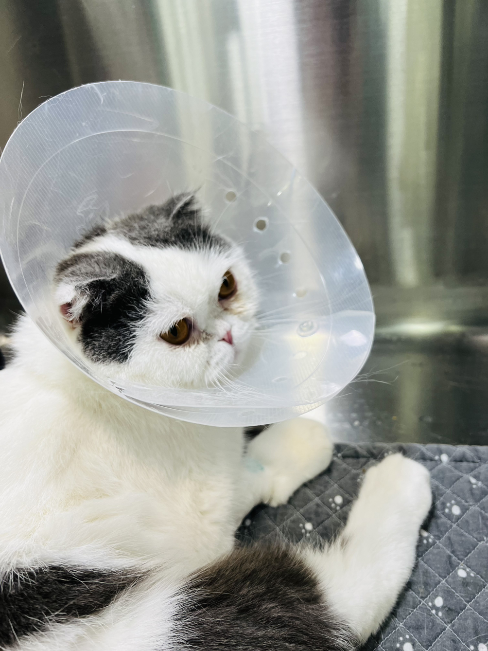 퇴근 후, 면회를 통해 마주한 망고는 울상 그 자체였다. 큰 눈에 눈물이 그렁그렁 맺혀있었고 넥카라로 인해 그루밍을 하지 못한 탓인지 눈 주변에는 눈물자국이 남아 굳어있기도 했다. 여전히 카테터를 꽂고 오른쪽 앞다리에는 링거를 꽂은 채 불편한 자세로 있는 망고를 보니 마음이 편치 않았다. 그럼에도 불구하고 애써 웃으며 망고를 달랬다. ‘우리 아기 밥은 잘 먹고 있었어? 엄마가 너무 늦게 왔지, 미안해.’ 그 말에 하소연이라도 하듯 얼굴을 비비다가 뒷모습을 보여주던 망고의 모습에 얼마나 속이 상했는지 모른다. 삐친 듯한 망고를 달래며 겨우겨우 밥을 조금 먹이고 어느덧 집에 갈 시간이 되어 갈 채비를 하는데, 또 동그란 눈으로 우릴 바라보는 망고를 보니 차마 발걸음이 떨어지질 않았다. 당장이라도 아이를 데리고 집에 가고 싶은 마음이 굴뚝같았다. 저 큰 눈망울이 자기도 집에 데려가달라고 말하는 것 같아서 눈물이 날 것만 같았다. 애써 울음을 삼키고 ‘엄마 내일도 올게. 우리 아기 코코낸내 잘하고 밥도 잘 먹고 있어. 내일 저녁에 또 만나.’라고 말해주었다.