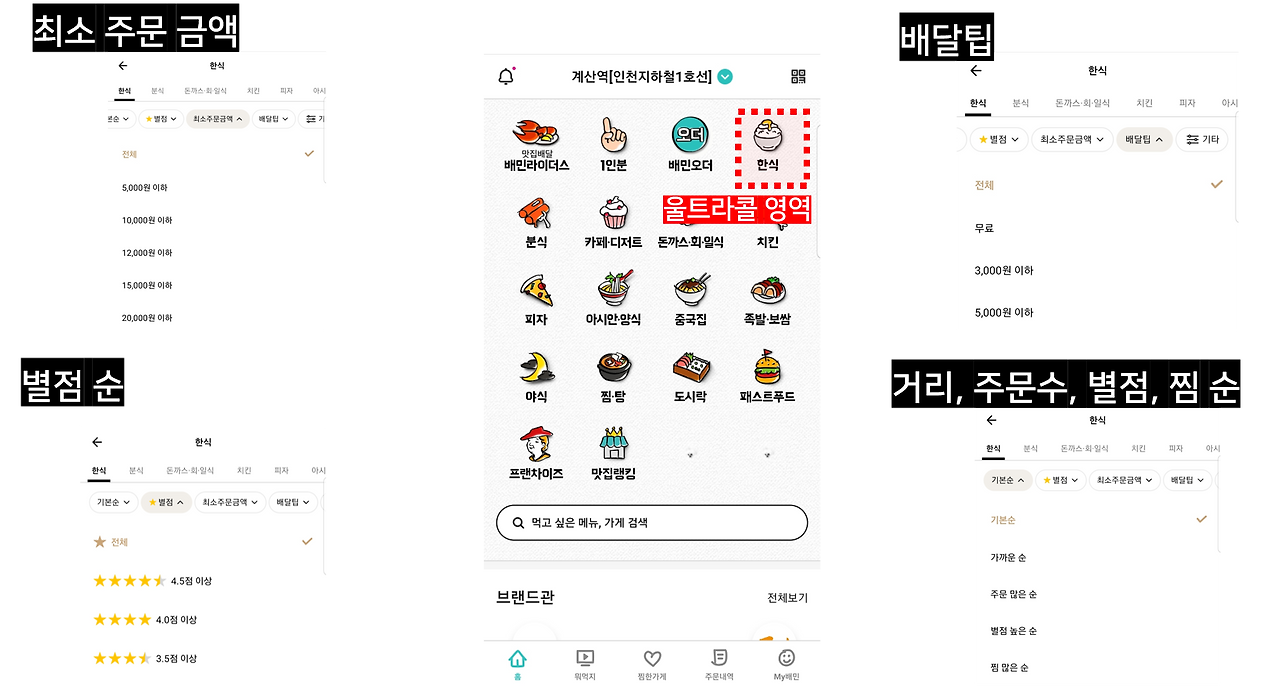 우선 고객들이 이렇게 많은 선택지 중 주문을 선택하는 기준은 리뷰, 상품 구성(가성비, 1인분), 별점, 인지도, 최소주문단가, 쿠폰, 배달료 등등으로 보인다. 배달의 민족은 누구보다 그 정보를 잘 알고 있었을 것이고, 이러한 트랜드를 반영하여 앱에 다음과 같은 기능을 강화하였다.