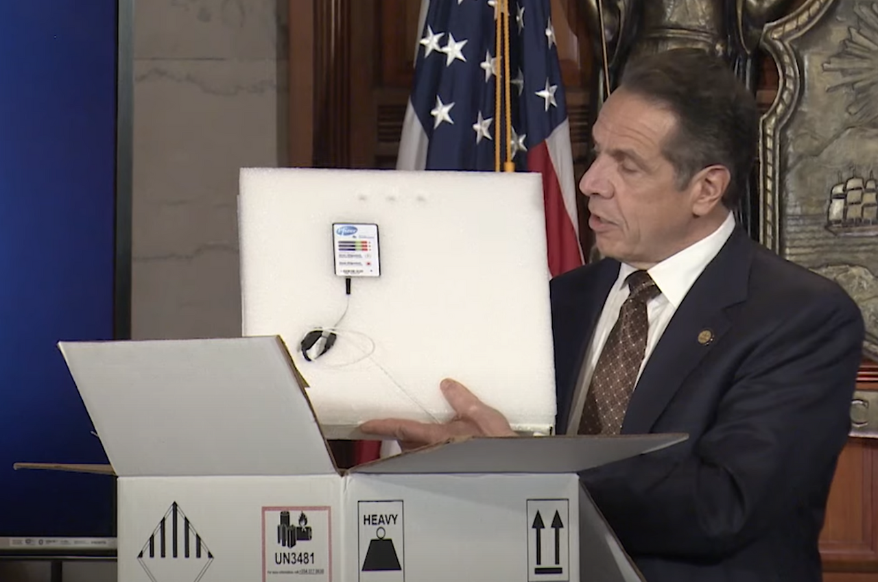 위의 그림처럼 Pfizer 공장에서 제조된 백신이 UPS, Fedex 등의 비행기로 미국에 들어와서 전국 병원 등으로 배포가 된다. 뉴욕 주지사 Cuomo는 기자들 앞에서 직접 포장재를 오픈하여 백신을 공개하였는데, 이 장면에 보면 박스 오픈 후 상단 커버에 Pfizer 브랜드가 붙은 디바이스가 있는데, 이것이 IoT 실시간 센서이다.