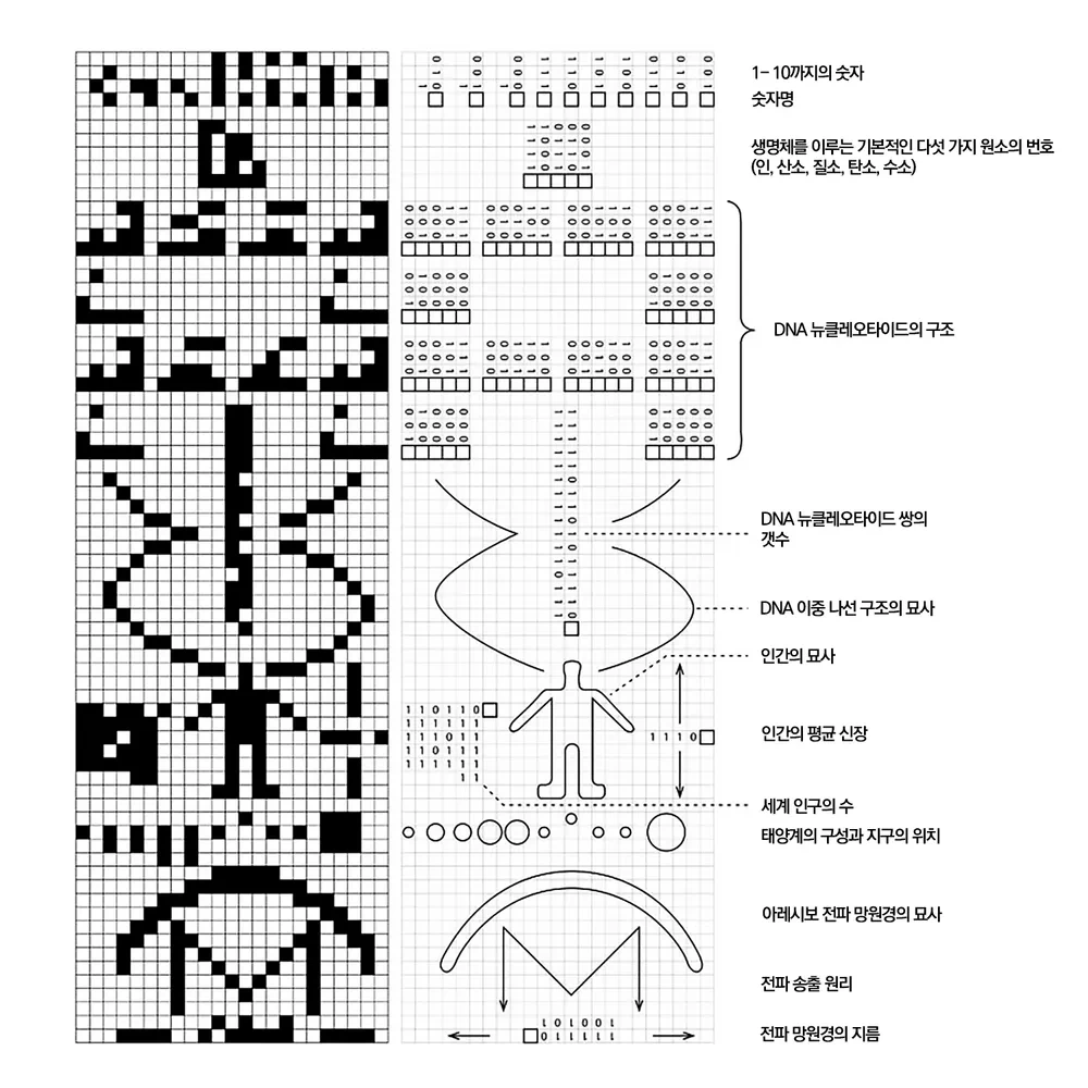 책에서 우주 탐사선 보이저 1호와 2호에 실린 레코드판에 관한 부분을 읽다가 나는 울었다. 1977년에 발사되어 드넓은 우주 속으로 영원한 항해를 떠난 두 척의 보이저 탐사선에는 구리에 금박을 입힌 레코드판이 한 장씩 실려 있다. 레코드판뿐만 아니라 레코드 바늘과 카트리지, 겉표지에는 사용법이 적혀 있다. 만약 성간을 항해 중인 또 다른 외계 문명인이 있다면 그들에게 우리의 존재를 알린다는 뜻에서 레코드판에는 인간의 유전자, 사람의 두뇌, 우리의 도서관에 대한 정보와 예순 종류의 언어로 된 사람의 인사말, 세계 각지에 사람들이 서로 보살피고 예술품을 만들고 각종 도전에 응하는 모습의 사진들과 지구상 여러 문화권에서 즐기는 음악을 1시간 30분 분량으로 편집하여 수록했다. 이 레코드판에는 광대하고 적막한 우주 한복판에서 지구인이 느끼는 우주적 고독감과 이 고독에서 간절히 벗어나고자 하는 소망, 우리만큼이나 쓸쓸히 이 심연을 항해 중인 외계 문명이 어딘가 존재할 것이며 그들과 닿기를 바라는 인류의 갈망이 담겨 있어 가슴 시리게 애처롭다. 마치 저 푸른 바다 위, 누구의 발길도 닿지 않은 무인도에 홀로 떨어진 조난자가 외로움에 몸부림치다 자신의 존재를 알리기 위해 열심히 바다 너머로 희망의 종이비행기를 날리는 것처럼 느껴져 눈물이 난다. 우주로 향하는 인간의 절절한 종이비행기에는 보이저 탐사선의 레코드판뿐만 아니라 1974년 푸에르토리코의 아레시보 전파 망원경을 통해 날려 보낸 무선 메시지도 있다.
