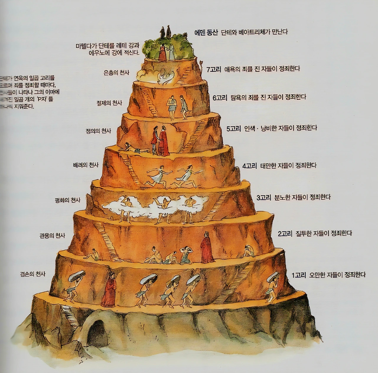 지옥에 갈 만큼의 중죄는 아니지만, 그렇다고 바로 천국에 갈 만큼 깨끗하지는 않은 영혼들은 연옥의 정죄산에서 일정 기간 동안 그들의 죄를 씻는다. 이 속죄의 시간이 끝나면 영혼은 천국으로 갈 수 있게 된다. 연옥에서의 형벌도 지옥만큼이나 가혹하지만 이곳에는 지옥에는 없는 '희망'이 존재한다. 단테가 정죄산의 각 층을 오를 때마다 천사가 그의 이마에 새겨진 7개의 P를 하나씩 지워준다. 이 P는 '죄'를 뜻하는 'Peccati'의 머릿 글자로 일곱 가지의 대죄를 뜻한다. 마침내 길잡이 베르길리우스와 정죄산의 꼭대기인 지상 낙원에 도달한 단테는 악(惡)을 모두 잊게 해주는 레테 강물을 마시고 베아트리체와 함께 천국으로 들어선다.
