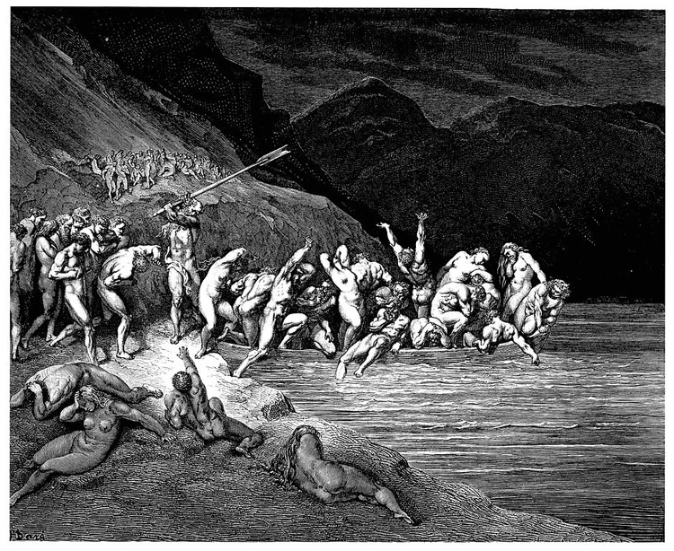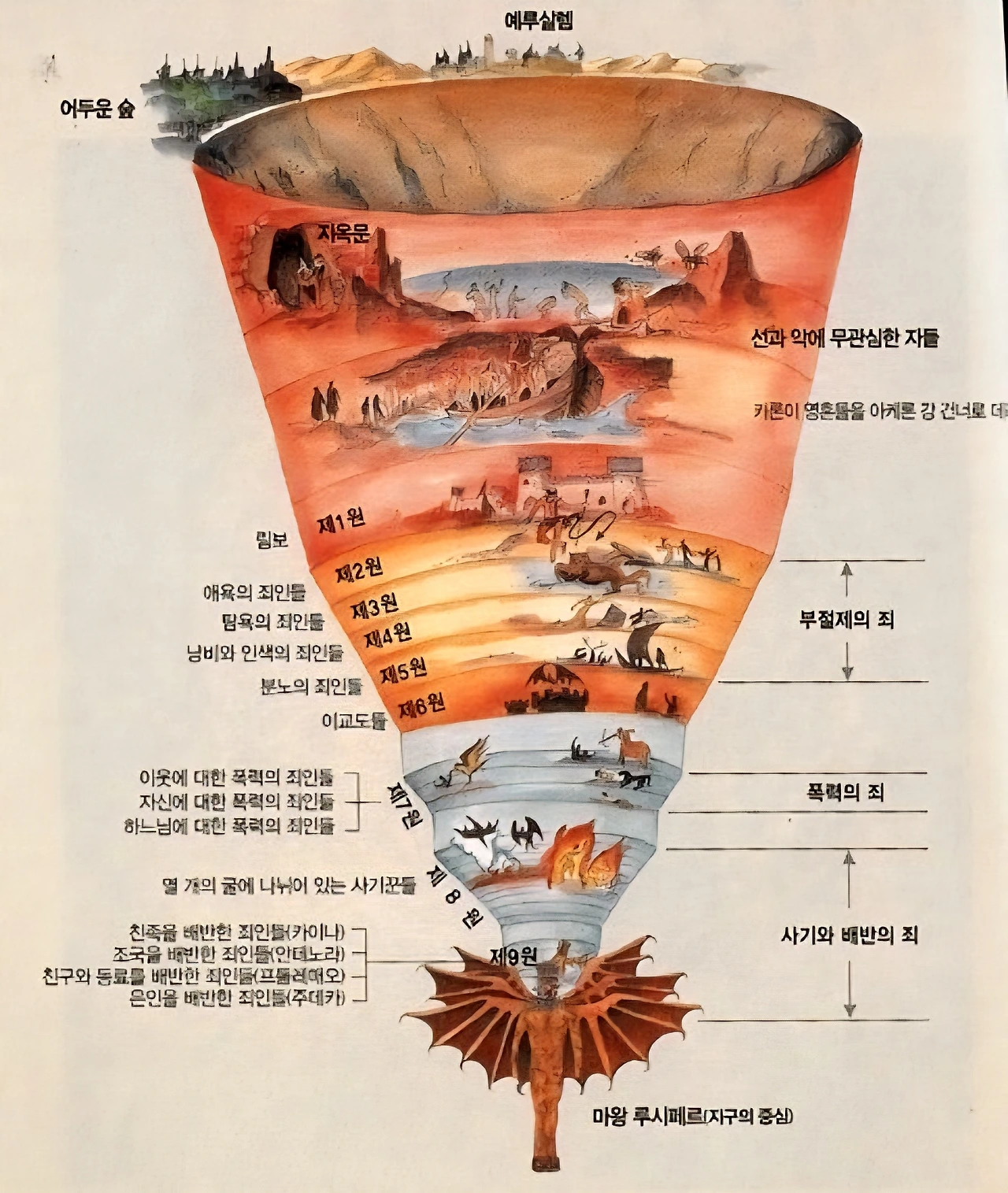 위 그림은 지옥의 구조를 좀 더 자세히 나타낸 그림이다. 지옥은 총 제 1환부터 9환까지 9개의 공간으로 나누어져 있고 아래로 내려갈수록 점점 좁아지며 더 무거운 죄를 지은 영혼들이 존재한다. 사공 카론이 죄인들을 배에 싣고 아케론 강 건너로 싣고 오게 된다.