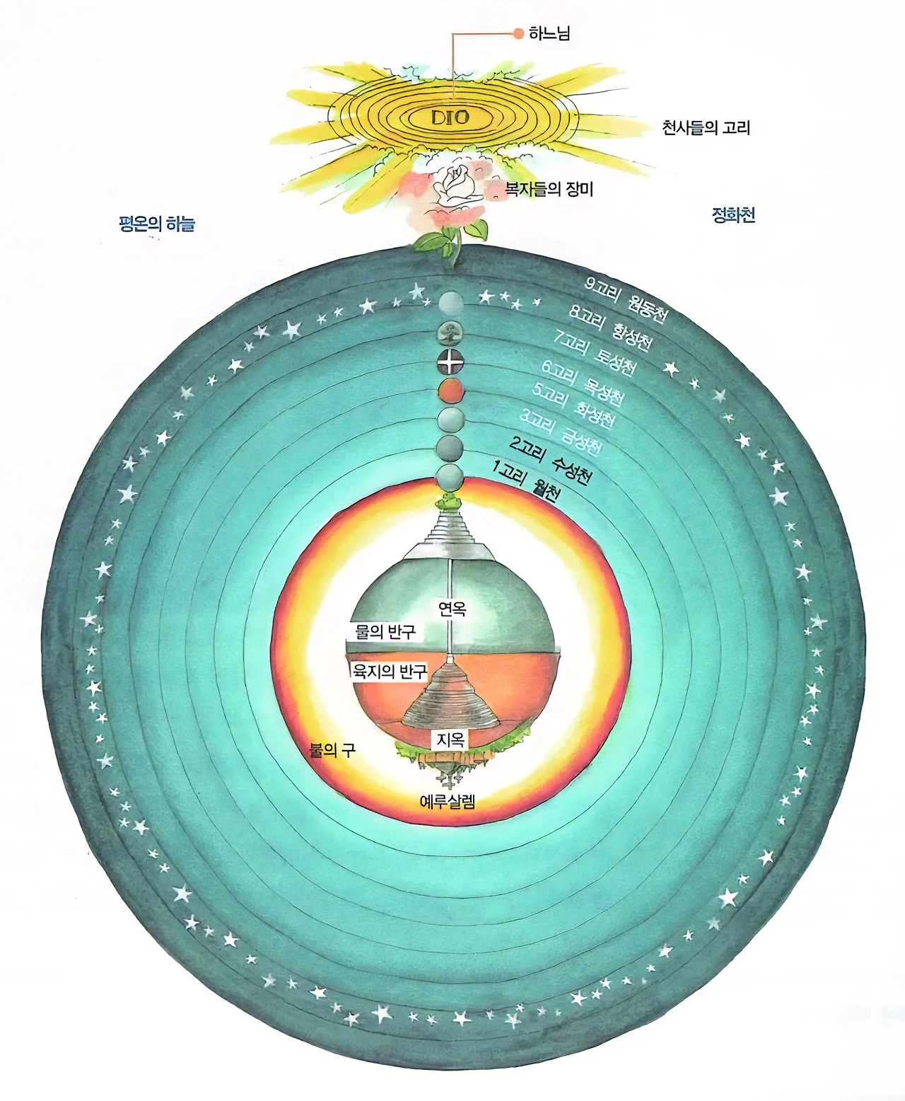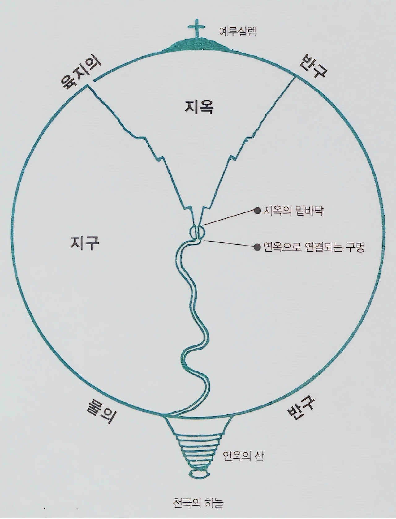 <신곡> 속 묘사에 따르면 우리가 살고 있는 지구의 북반구는 육지로 이루어져 있으며, 예루살렘을 기준으로 지구 중심을 향해 수직으로 내려가면서 점점 좁아지는 형태로 지옥이 존재하고 있고, 지옥의 가장 밑바닥이자 악마 루시퍼가 위치한 지구의 중심을 지나 반대편으로 쭉 나아가면 연옥의 정죄산이 위치하고 있다. 단테가 살던 중세에는 남반구는 사람이 살지 않으며, 모두 물로 이루어져 있다고 생각했다.