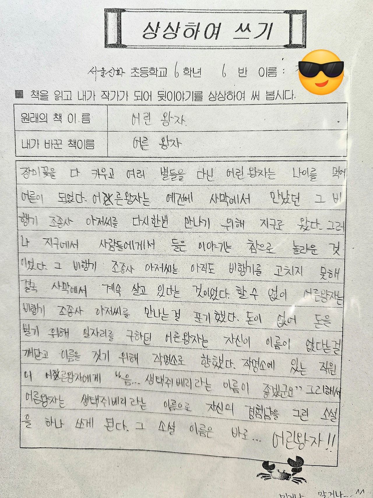 이걸 읽고 다시 한번 느꼈다ㅋㅋㅋㅋ사람은 자라면서 갑자기 변하는 게 아니다. 대부분은 어릴 때 이미 자기 성향들이 다 있다. 초딩때도 나는 지극히 현실적인 결말을 좋아했나 보다. 조종사 아저씨는 비행기를 못 고쳐서 결국 그냥 사막에 눌러앉아서 살게 됐고, 어린 왕자는 나이를 먹어 어른이 된 후 돈이 없어서 일자리를 구하던 중 자기가 이름이 없다는 걸 깨닫고 작명소에 가서 이름을 짓고 본인의 경험담으로 소설을 쓰게 된다는...그래...비록 초딩 6학년이었지만 어린 왕자도 지구에서 살려면 왕자고 뭐고 일단 생계 수단이 있어야 한다고 생각한 나의 마인드..확고해...