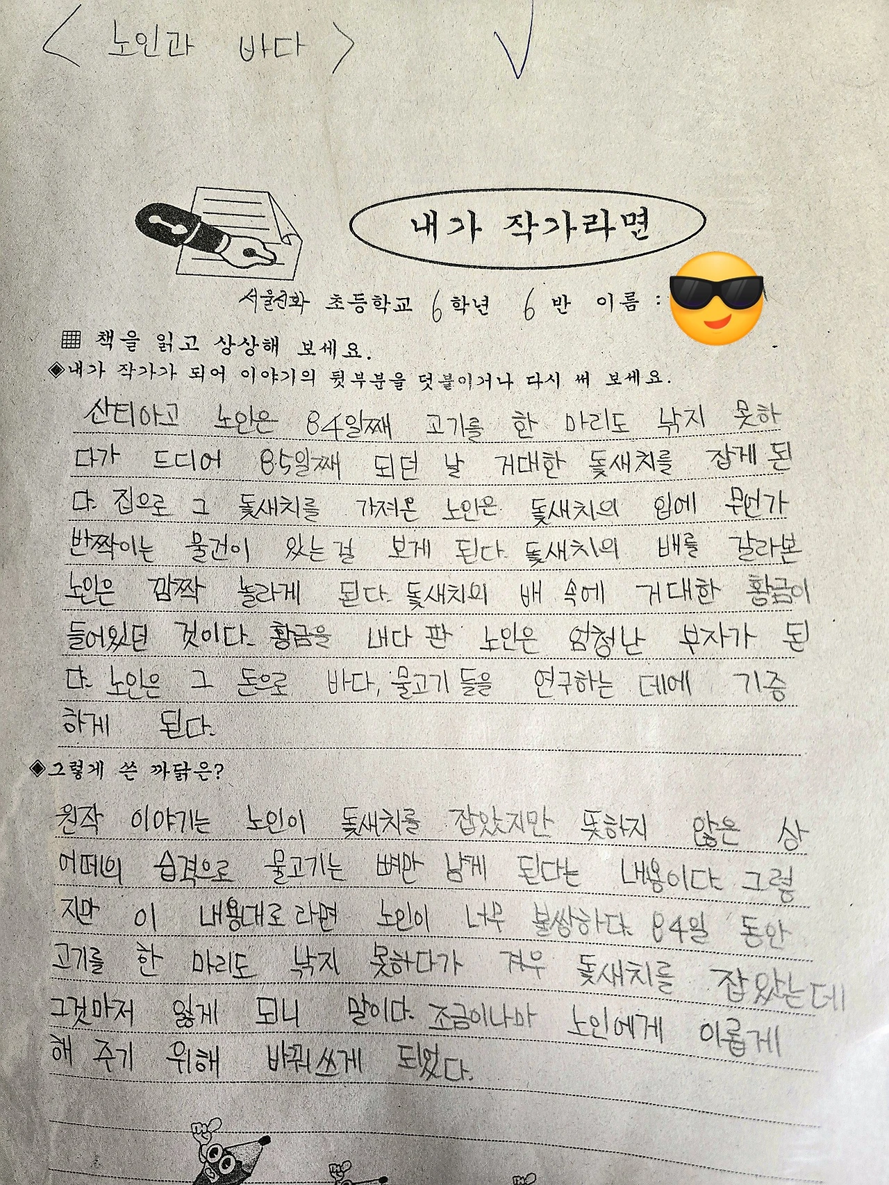 바다 위 치열했던 사투를 끝내고 집으로 돌아와 달콤하고 기나긴 잠에 든 산티아고 노인의 상처투성이인 손을 어루만지며 말하고 싶다.