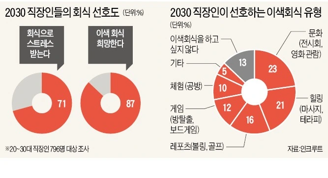 2019년 <한경>에서 게시한 2030 직장인들의 회식 선호도를 보면 회사에서 입사해 10년 차 이전의 직장인들은 회식으로 인해 스트레스를 받는다는 의견이 71%에 달한다.